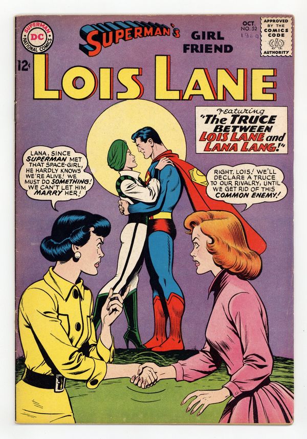Cover art by Kurt Schaffenberger. Smoking is for Squares! public service announcement, script by Jack Schiff, art by Sheldon Moldoff. Lois Lane's Pen-Pal Romance!, art by Kurt Schaffenberger; Lois tries to find out if organized crime is behind a scheme to swindle women through bogus pen-pals. Lois Lane's Love Trap!, art by Kurt Schaffenberger; On assignment, Lois meets a girl who shares her name and Clark and Lois help her get together with the man she loves. The Lois Lane - Lana Lang Truce!, art by Kurt Schaffenberger; Lois and Lana are jealous when a woman from outer space arrives in Metropolis and attracts Superman's attention. Lois Lane's Time Trips article. Rocky and Bullwinkle star in a one-page Cheerios ad. 36 Pages, Full Color. Cover price $0.12.