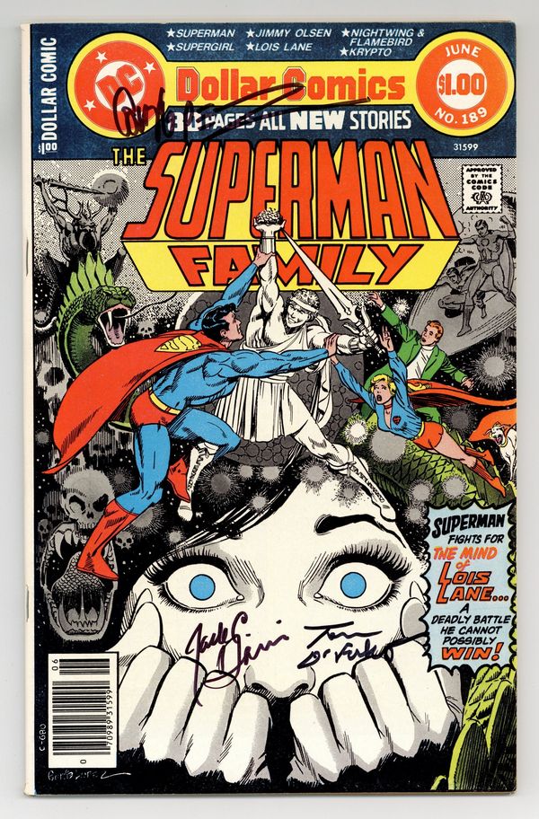 Cover art by Jose Luis Garcia-Lopez. The Night of the Looters starring Jimmy Olsen, script by Tom DeFalco, art by Kurt Schaffenberger. The Mass Murderer from Krypton starring Superman, script by Gerry Conway, pencils by Kurt Schaffenberger, inks by Tex Blaisdell. The Star Who Loved Lois Lane!, script by Tom DeFalco, pencils by Kurt Schaffenberger, inks by Tex Blaisdell. The Second Fastest Dog in Oregon starring Krypto, script by Bob Toomey, art by Juan Ortiz. The Crime-Lord of Kandor starring Nightwing and Flamebird, script by Paul Kupperberg, pencils by Ken Landgraf, inks by Romeo Tanghal. Memories of Menace starring Supergirl, script by Jack C. Harris, pencils by Jack Abel, inks by Frank Giacoia. 84 pgs. $1.00. Cover price $1.00.