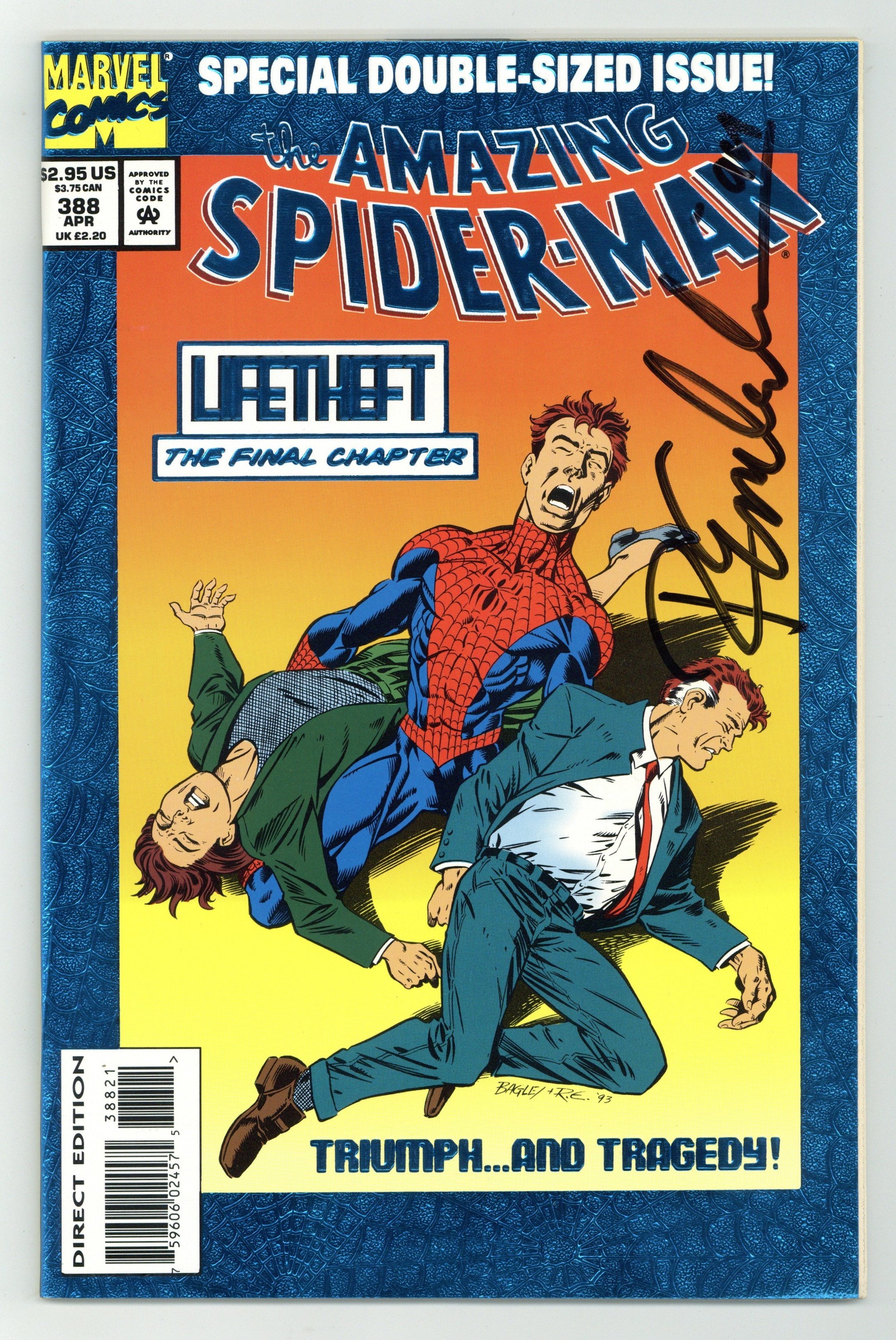 Deluxe Direct Edition. "The Sadness of Truth" Life theft Part 3 of 3. Double-sized issue. Direct Edition. Script by David Michelinie. Pencils by Mark Bagley. Inks by Randy Emberlin. Blue foil cover by Mark Bagley and Randy Emberlin. Shock follows shock as Peter Parker learns the painful truth about his parents! Inside the Chameleon's New Jersey hideaway, the faceless villain reveals that Richard and Mary Parker are artificial simulacrums (aka life model decoys). The web-slinger is stunned. But there's no time for sorrow as the wall-crawler must stop his "parents" from revealing his secret identity! Once the Chameleon morphs Richard into a killing machine the battle lines are drawn: the Vulture, the Chameleon, and the Richard LMD vs. the Amazing Spider-Man! As the fight progresses, could a mother's love -- even the love from an artificial mom -- propel her web-spinning son to victory? A heartbreaking ending for all. Final appearances of the Richard Parker and Mary Parker life model decoys. Cameo appearances by Aunt May and Mary Jane Watson. Elements of the story continue in Spider-Man 45. Second story: "The Lost Days" Script by David Michelinie. Art by Ron Lim (breakdowns)and Tom Palmer (finishes). This story provides details of Venom's activities prior to Amazing Spider-Man 300. Flashback cameo by Peter Parker. Third story: "My Enemy's Enemy" Script by David Michelinie. Art by Larry Alexander. Cardiac and Chance attack the same corrupt corporation with different ideas about how to put it out of business! (Note: This issue completes David Michelinie's unparalleled 7-year run as the writer of the Amazing Spider-Man title -- highlighted by Peter and Mary Jane's wedding, the co-creation of Venom, and the introduction of Peter Parker's parents.) 68 pages. Cover price $2.95.