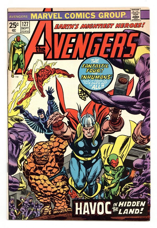 Tags: Marvel Legacy Numbering: Avengers (part 127), Avengers$15.75"Bride and Doom!" Part 1 of 2. Guest-starring the Fantastic Four and the Inhumans. Script by Steve Englehart. Art by Sal Buscema (breakdowns) and Joe Staton (finishes). Cover by Gil Kane and Mike Esposito (with John Romita touch-ups). Gorgon and Lockjaw arrive at Avengers Mansion to take Earth's Mightiest Heroes to Attilan for the wedding of Crystal and Quicksilver! Just one small problem though…the Avengers much less the Scarlet Witch never received an invitation from Pietro! Nonetheless, the Avengers are happy to go and minutes later reunite with the Inhumans and the Fantastic Four in the Hidden Land! Will Wanda and Pietro make peace before the wedding? How about Crystal and the Human Torch? Or Mantis and the Swordsman? Unfortunately, any and all reconciliation attempts are interrupted by Maximus, Omega, and the rampaging Alpha Primitives! And shortly thereafter the wild free-for-all begins! But the Avengers, Fantastic Four, and Inhumans should have enough firepower to stop these wedding crashers! Unless there is one more lurking in the shadows! Perhaps a certain adamantium wedding crasher! Oh yes, the day that began as blissful as heaven…becomes an awesome encounter with Ultron-7! Story continues in Fantastic Four 150 (part 2). Cameo appearances by Agatha Harkness and Franklin Richards. Flashback cameo by Omega to recap the events of Fantastic Four 131 and 132. Avengers Lineup: Iron Man, Mantis, Scarlet Witch, Swordsman, Thor, and the Vision. (Notes: Ultron previously appeared in Avengers (1st series) 68 and returns in Avengers 161. The letters page includes a letter from comics writer Ralph Macchio. The letters page also contains Marvel Value Stamp Series A #13 Doctor Strange by Steve Ditko.) 36 pgs. Cover price $0.25.
