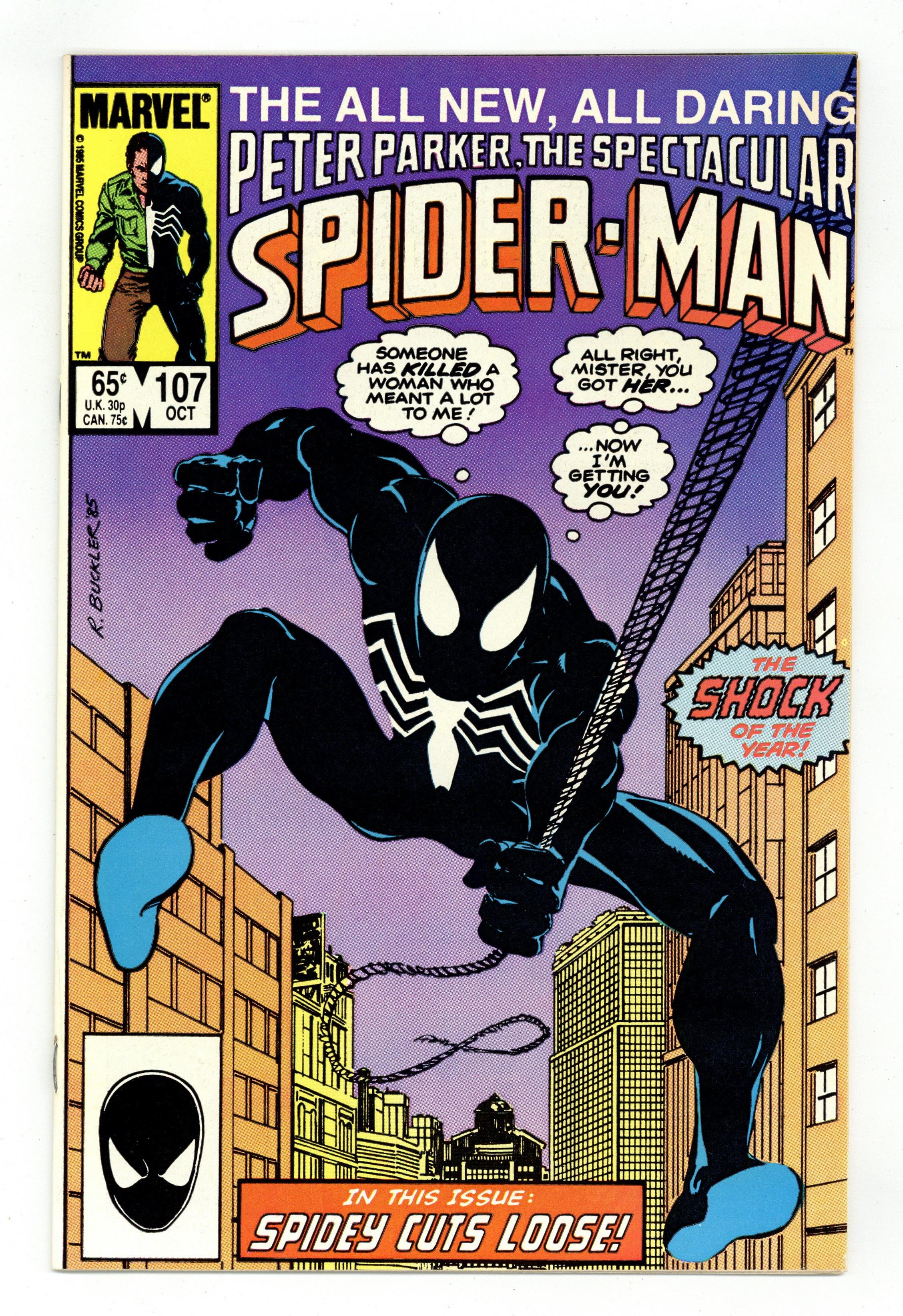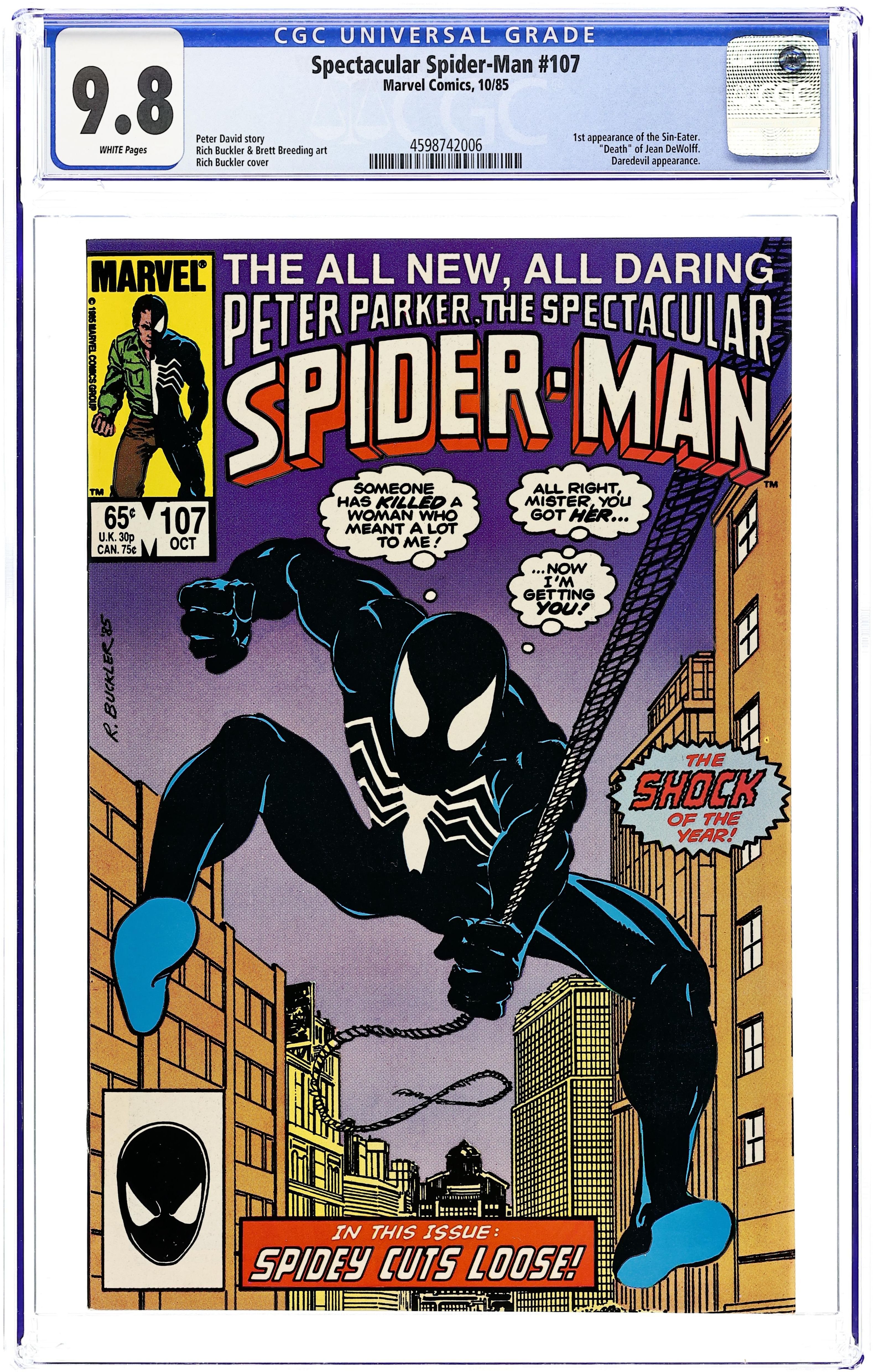 Tags: Marvel Legacy Numbering: Spectacular Spider-Man (part 107), Spider-Man$18.00Direct Edition. "Original Sin" Part 1 of 4. Guest-starring Daredevil. Script by Peter David. Pencils by Rich Buckler. Inks by Brett Breeding. Cover by Rich Buckler. The critically acclaimed Death of Jean DeWolff storyline begins with this issue. In a stunning development, police captain Jean DeWolff is found murdered in her apartment. The entire city is in a state of shock over the killing including the police department, the staff at the Daily Bugle, and the Amazing Spider-Man. The web-slinger (in his black costume) begins investigating the homicide by meeting with the detective assigned to the case, Stan Carter. However, another superhero, Daredevil, gets the first shot at stopping the murderous rampage of the Sin-Eater! First appearance of the Sin-Eater. 32 pages Cover price $0.65.