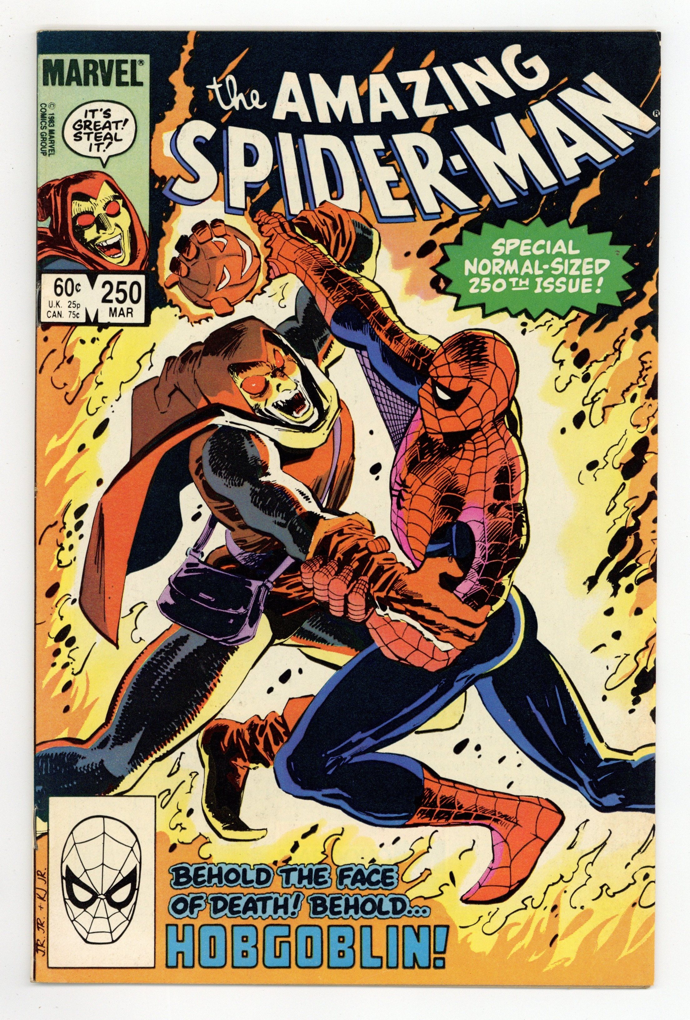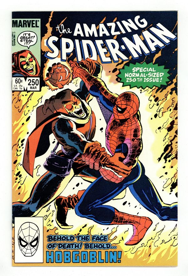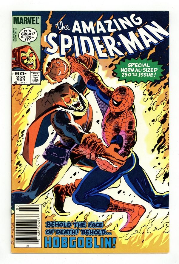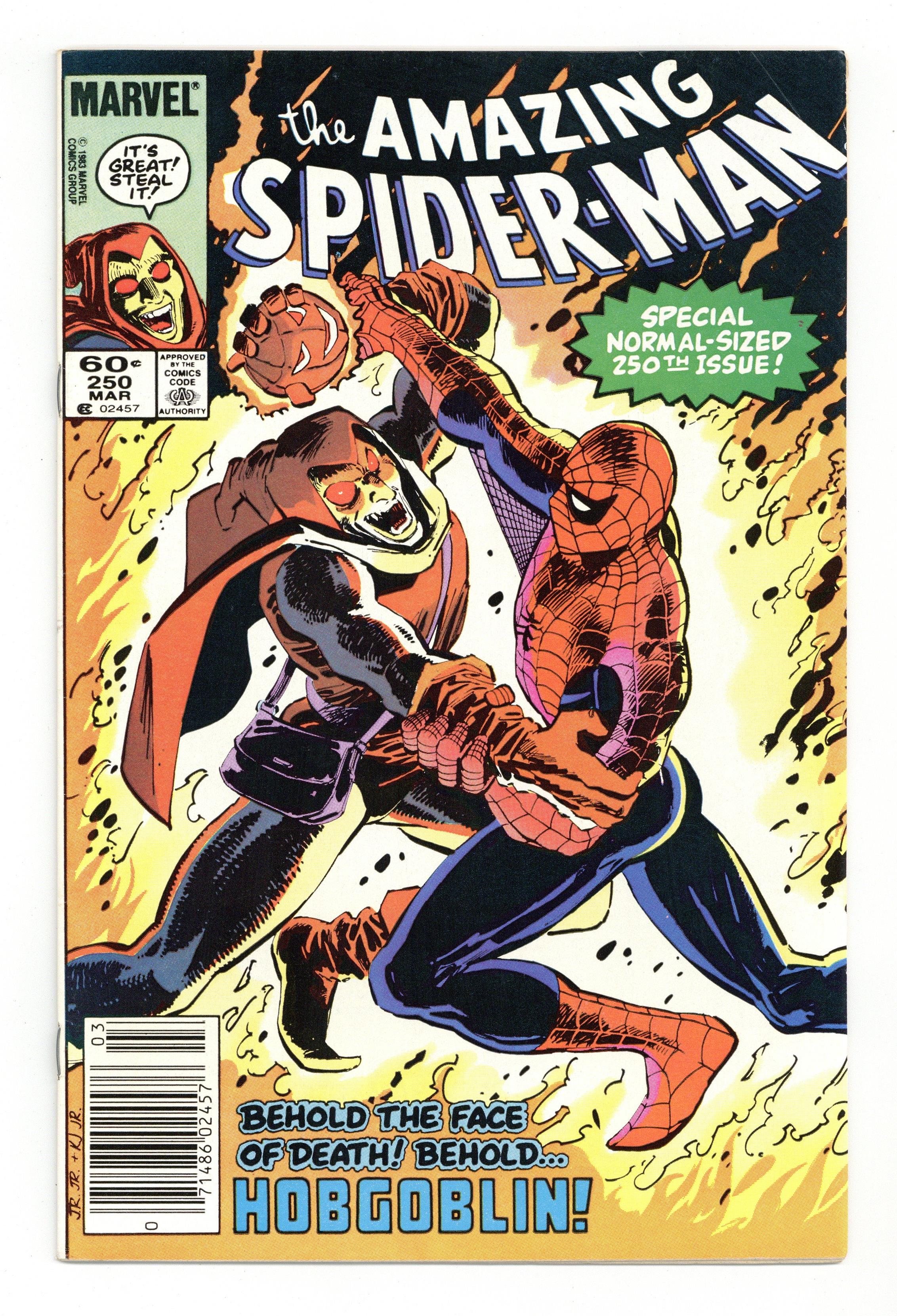 Tags: Marvel Legacy Numbering: Amazing Spider-Man (part 250), Spider-Man$14.00Direct Edition. "Confessions!" Part 2 of 3. Script by Roger Stern. Art by John Romita Jr. (breakdowns) and Klaus Janson (finishes). Cover by John Romita Jr. and Klaus Janson. The web-slinger's one-man war vs. the Hobgoblin continues! The amazing one privately contacts all the businessmen being extorted (by the goblin) in hopes of getting a lead on the super-villain's whereabouts! But eventually Spider-Man locates the Hobgoblin the old-fashioned way...with a spider tracer! In the Big Apple's Warehouse District, the wall-crawler comes face to face with his startled foe! Can the web-slinger score a quick victory and end the menace of the new goblin? Meanwhile, J. Jonah Jameson decides it's time to confess his involvement in the development of the Scorpion. The Daily Bugle's publisher prepares to take his mea culpa...in the pages of his own newspaper. Cameo appearances by Harry Osborn and Roderick Kingsley. Flashback cameo by the Kingpin. (Notes: This issue completes the sensational 2-year Stern-Romita Jr. run on the Amazing Spider-Man title. A magnificent collection of issues featuring the Black Cat, Foolkiller, Juggernaut, Cobra, and the Vulture; and of course, highlighted by the creation of the Hobgoblin.) 36 pgs. Cover price $0.60.