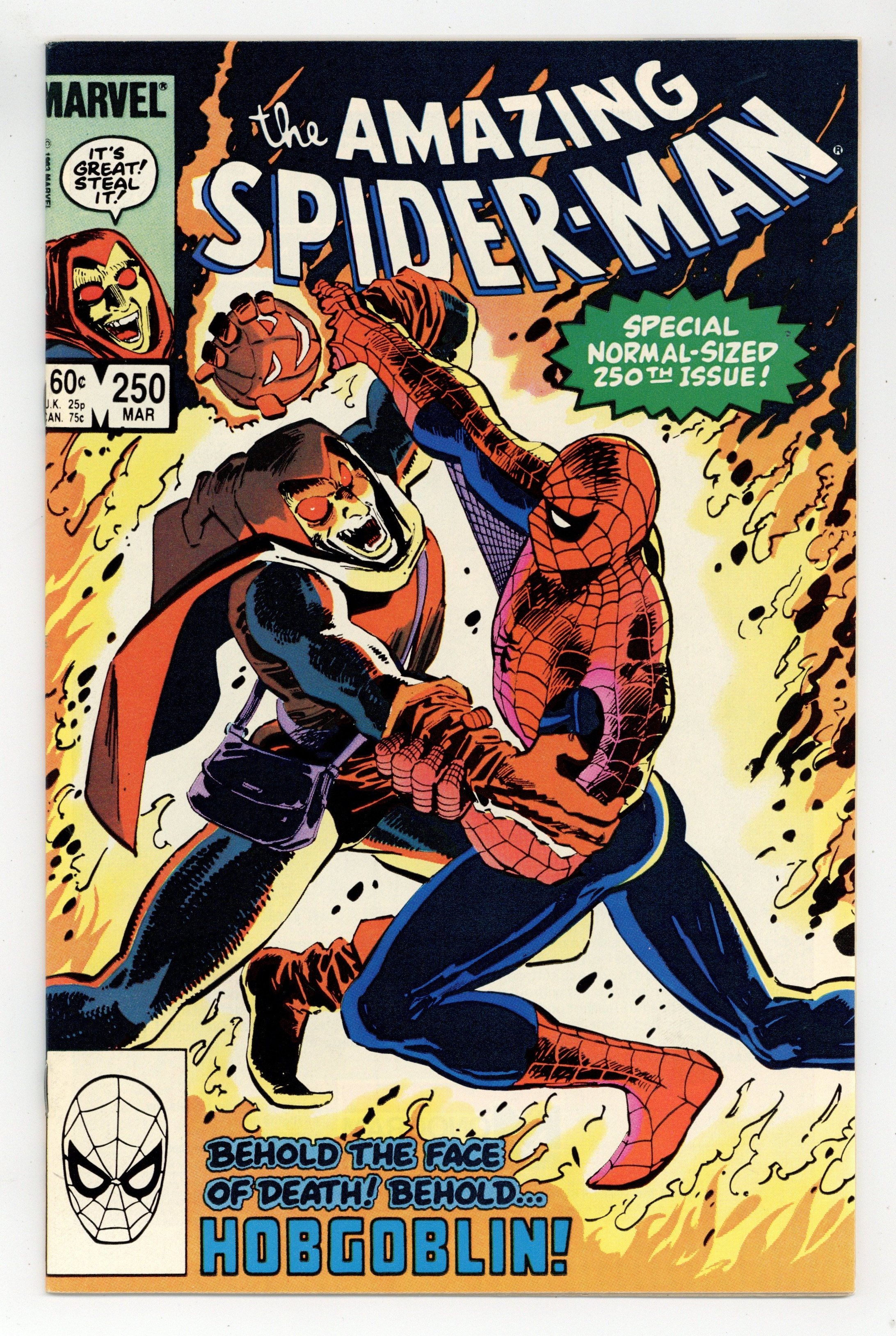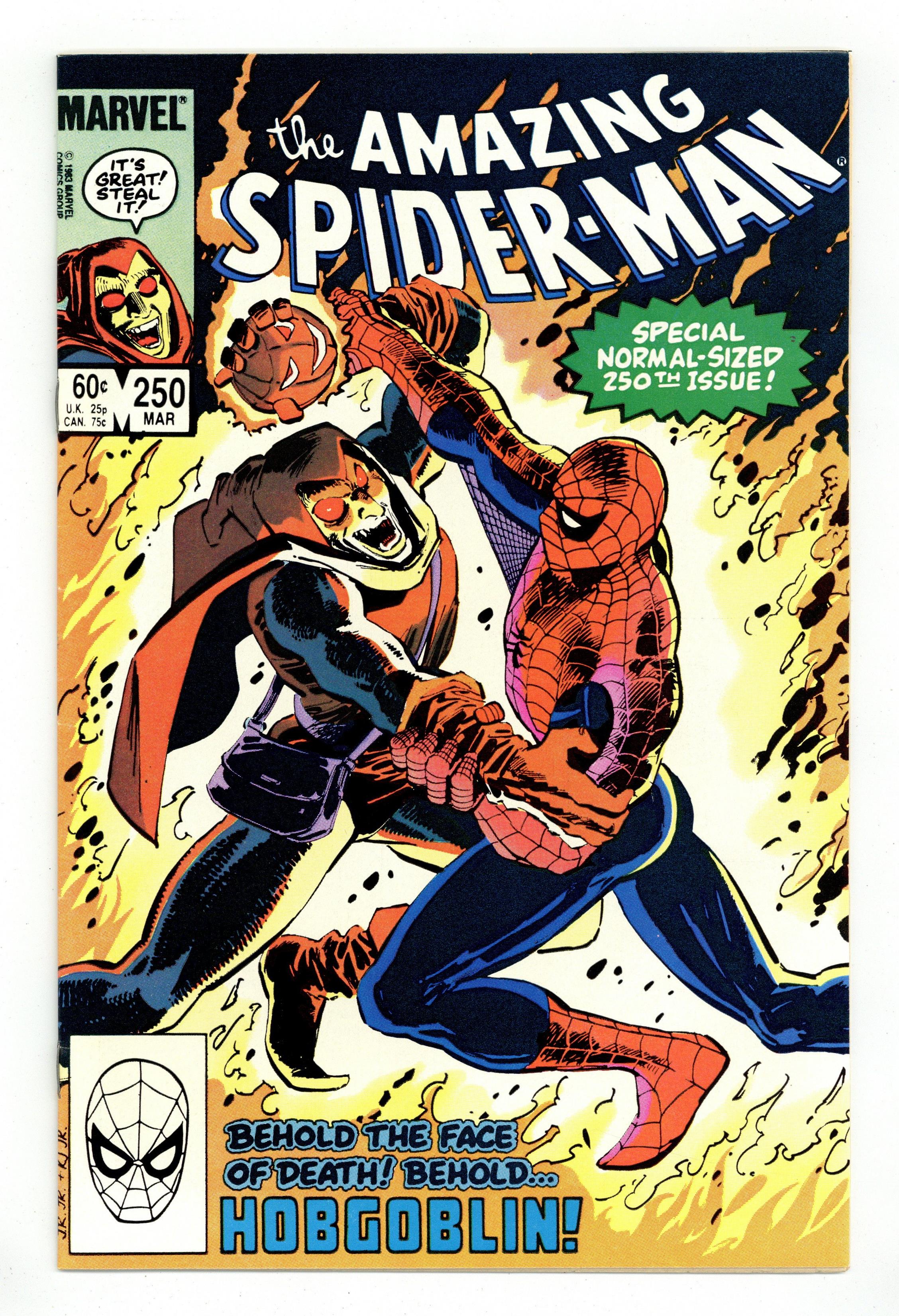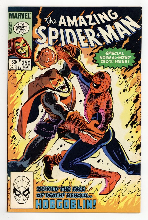 Tags: Marvel Legacy Numbering: Amazing Spider-Man (part 250), Spider-Man$19.00Direct Edition. "Confessions!" Part 2 of 3. Script by Roger Stern. Art by John Romita Jr. (breakdowns) and Klaus Janson (finishes). Cover by John Romita Jr. and Klaus Janson. The web-slinger's one-man war vs. the Hobgoblin continues! The amazing one privately contacts all the businessmen being extorted (by the goblin) in hopes of getting a lead on the super-villain's whereabouts! But eventually Spider-Man locates the Hobgoblin the old-fashioned way...with a spider tracer! In the Big Apple's Warehouse District, the wall-crawler comes face to face with his startled foe! Can the web-slinger score a quick victory and end the menace of the new goblin? Meanwhile, J. Jonah Jameson decides it's time to confess his involvement in the development of the Scorpion. The Daily Bugle's publisher prepares to take his mea culpa...in the pages of his own newspaper. Cameo appearances by Harry Osborn and Roderick Kingsley. Flashback cameo by the Kingpin. (Notes: This issue completes the sensational 2-year Stern-Romita Jr. run on the Amazing Spider-Man title. A magnificent collection of issues featuring the Black Cat, Foolkiller, Juggernaut, Cobra, and the Vulture; and of course, highlighted by the creation of the Hobgoblin.) 36 pgs. Cover price $0.60.