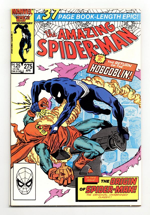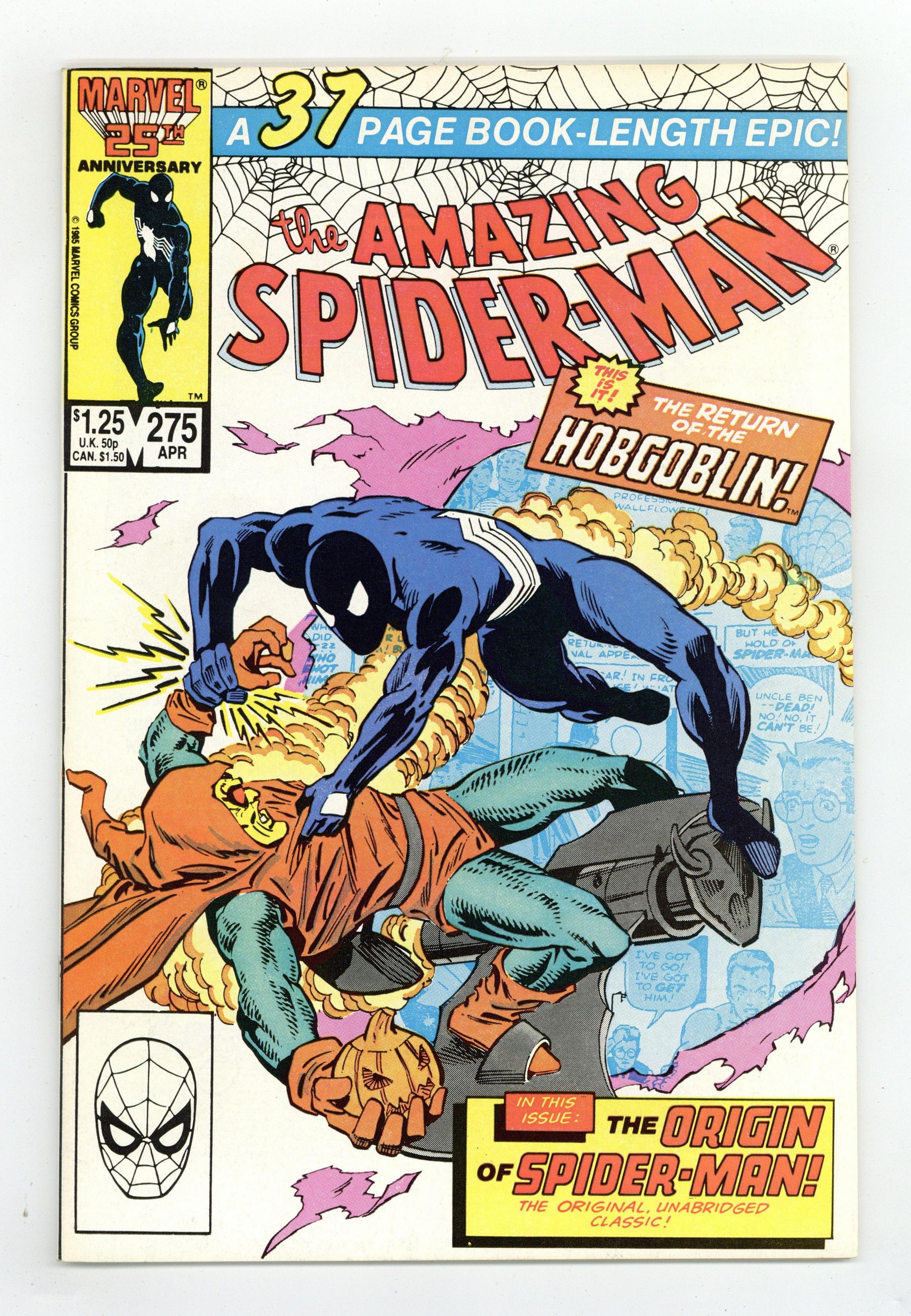 Tags: Marvel Legacy Numbering: Amazing Spider-Man (part 275), Spider-Man$18.00Direct Edition. "The Choice and the Challenge!" Part 1 of 2. Double-sized issue. Script by Tom DeFalco. Pencils by Ron Frenz. Inks by Joe Rubinstein. Cover by Ron Frenz and Joe Rubinstein. Affairs of the heart take center stage for Peter, Mary Jane, Betty, Ned, Flash, and Sha Shan as the long-time group of friends deal with a variety of relationship problems! But amid the soap opera-style drama, there is a super-villain on the prowl...the Hobgoblin! Armed with a new weapons system, the goblin circles the Port Authority Bus Terminal to draw out the web-slinger! Surprisingly the Hobgoblin's plan works! And then so does his new weapon! Is the goblin finally going to put Spidey down for the count? Cameo appearances by the Kingpin, Arranger, and Rose. Flashback cameos by the Green Goblin, Gwen Stacy, and the Sin-Eater. (Notes: Woven into the story are 11 (reprinted) pages of Spider-Man's origin from Amazing Fantasy 15. Script by Stan Lee. Art by Steve Ditko. On the cover the web-slinger and Hobgoblin break through a page from Amazing Fantasy 15. This issue was reprinted in Marvel Tales 283.)52 pgs. Cover price $1.25.