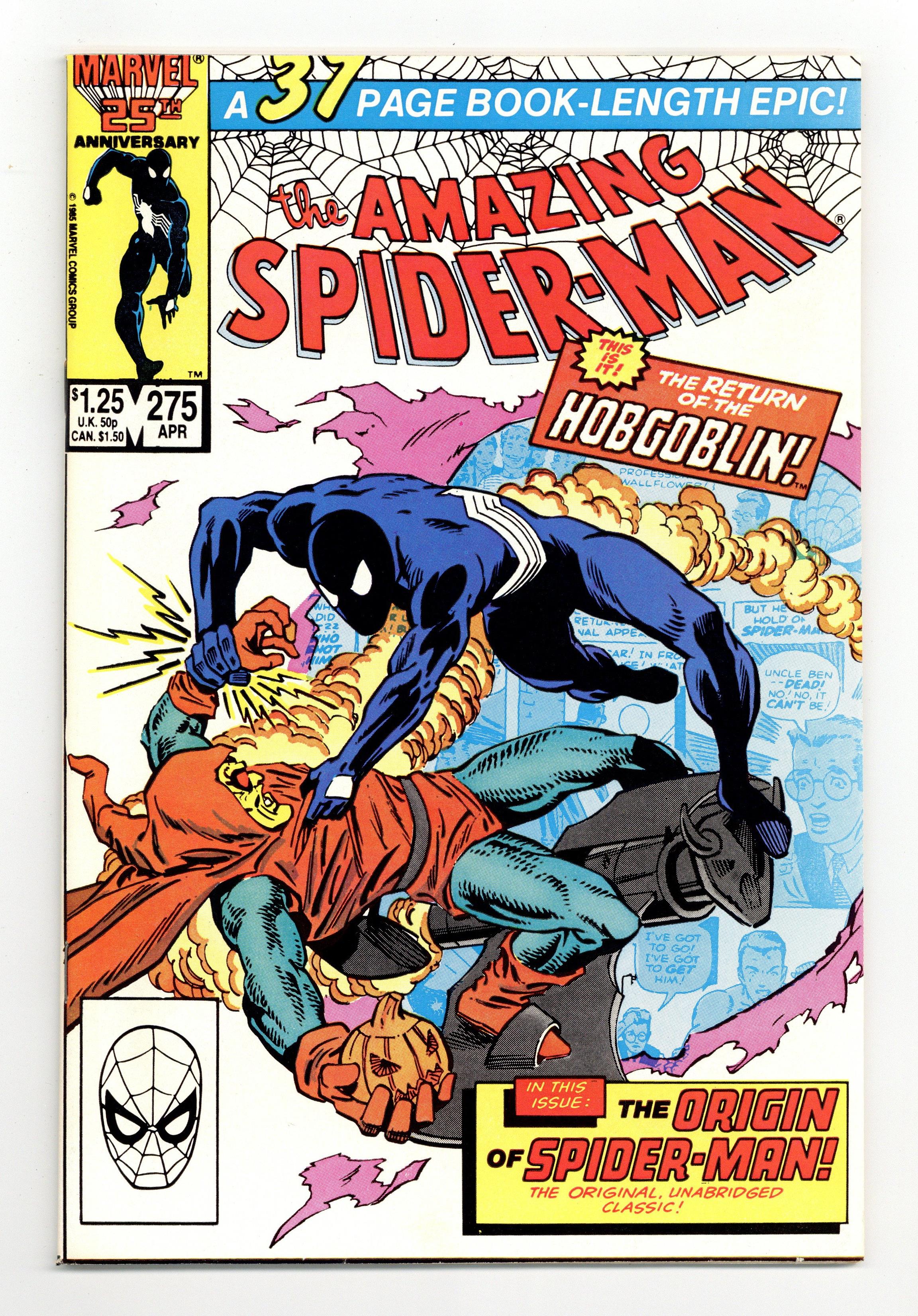 Tags: Marvel Legacy Numbering: Amazing Spider-Man (part 275), Spider-Man$16.00Direct Edition. "The Choice and the Challenge!" Part 1 of 2. Double-sized issue. Script by Tom DeFalco. Pencils by Ron Frenz. Inks by Joe Rubinstein. Cover by Ron Frenz and Joe Rubinstein. Affairs of the heart take center stage for Peter, Mary Jane, Betty, Ned, Flash, and Sha Shan as the long-time group of friends deal with a variety of relationship problems! But amid the soap opera-style drama, there is a super-villain on the prowl...the Hobgoblin! Armed with a new weapons system, the goblin circles the Port Authority Bus Terminal to draw out the web-slinger! Surprisingly the Hobgoblin's plan works! And then so does his new weapon! Is the goblin finally going to put Spidey down for the count? Cameo appearances by the Kingpin, Arranger, and Rose. Flashback cameos by the Green Goblin, Gwen Stacy, and the Sin-Eater. (Notes: Woven into the story are 11 (reprinted) pages of Spider-Man's origin from Amazing Fantasy 15. Script by Stan Lee. Art by Steve Ditko. On the cover the web-slinger and Hobgoblin break through a page from Amazing Fantasy 15. This issue was reprinted in Marvel Tales 283.)52 pgs. Cover price $1.25.