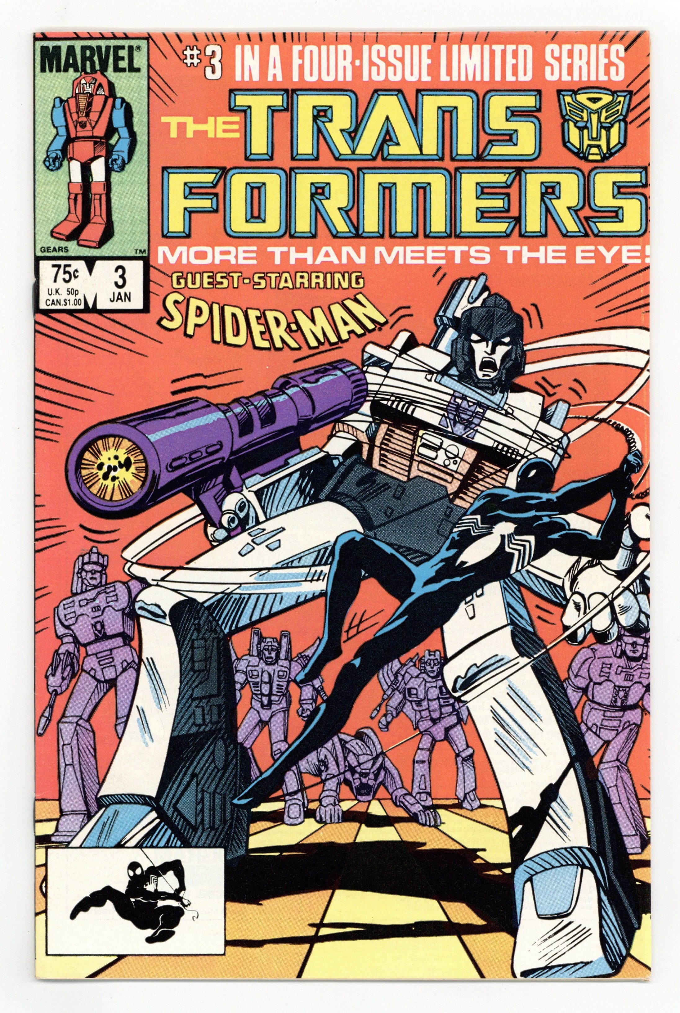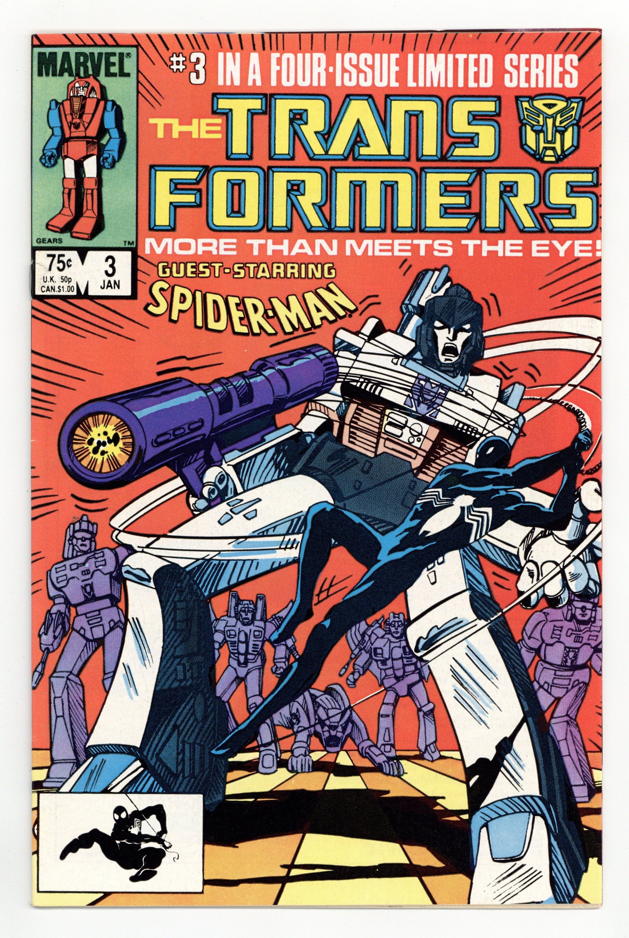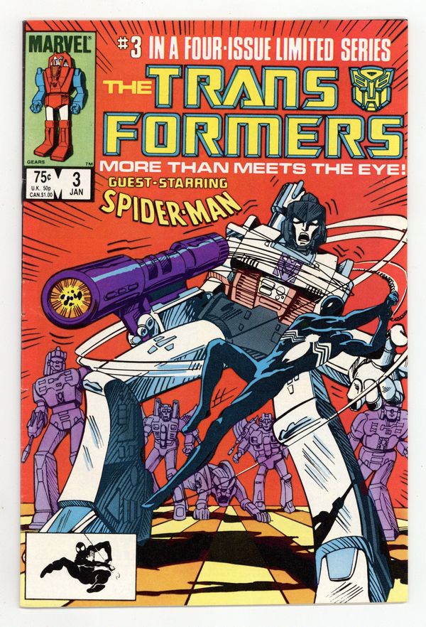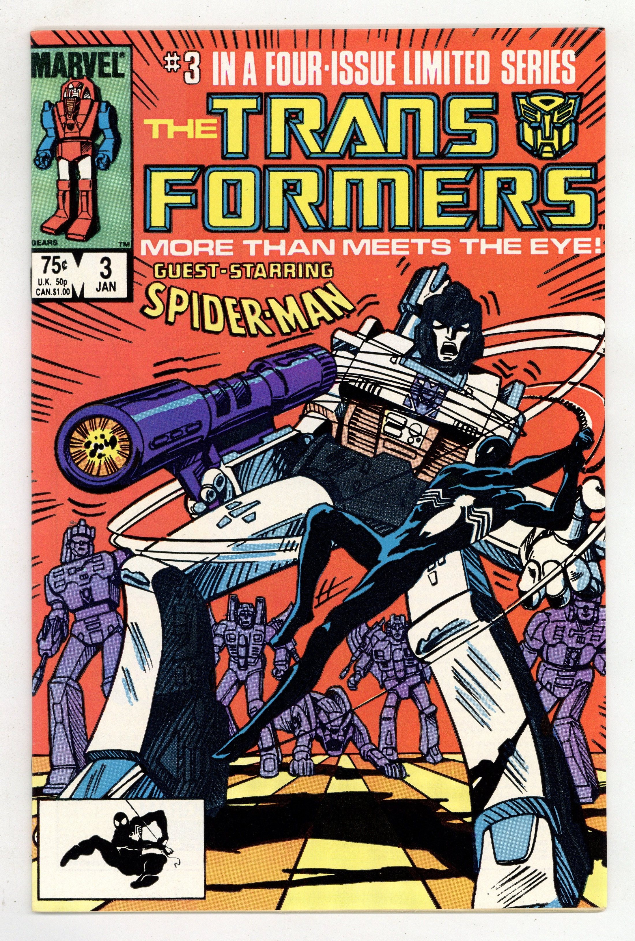 First Printing. Direct Edition. "Prisoner of War!" Part 3 of 4. Guest-starring the Amazing Spider-Man. Nick Fury cameo. Story by Jim Salicrup. Art by Frank Springer, Kim DeMulder and Mike Esposito. Cover by Mark Texeira. The Decepticons have taken control of a nuclear power plant. Now, with the world watching, the Autobots must stop their malevolent counterparts before it's too late. At least they'll get a little help from everyone's favorite Friendly Neighborhood Spider-Man. This is a first printing. All 2nd or 3rd printings have a 2nd, 3rd printing notice on inside at bottom of indicia on first/splash page. 2nd printings were done for most issues from #1 to #9. Cover price $0.75.