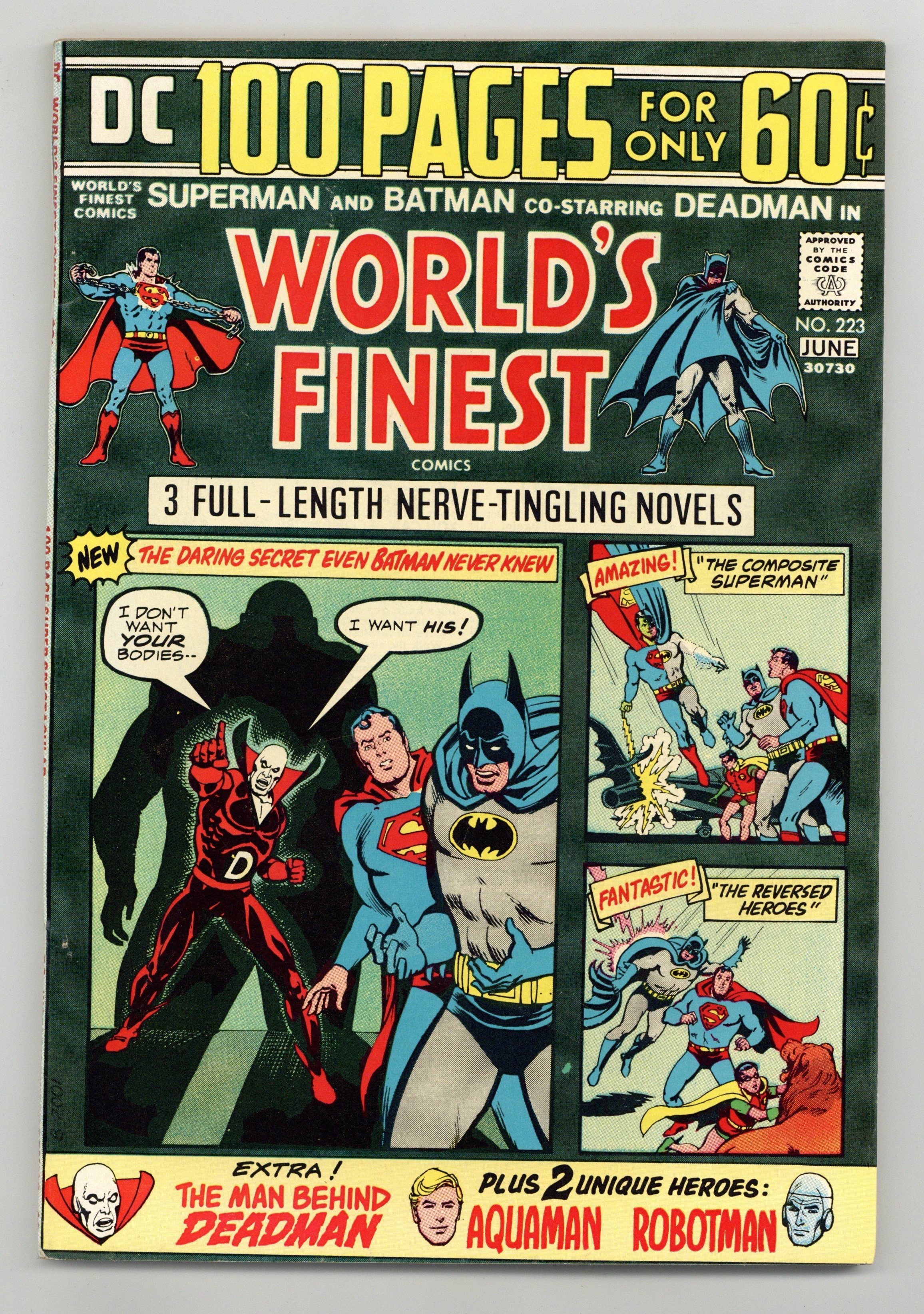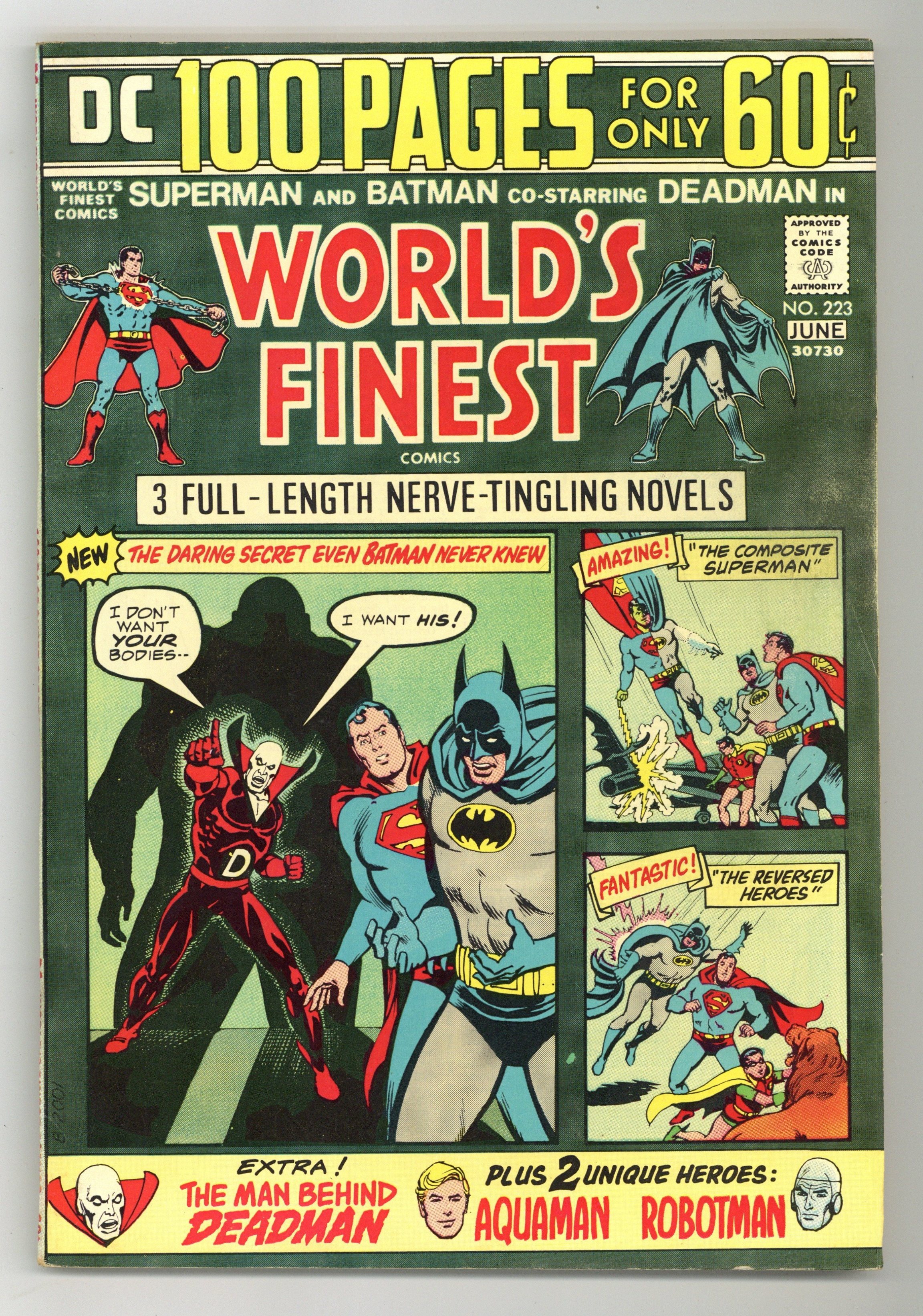 96-page giant. Cover art by Nick Cardy. Wipe the Blood Off My Name! starring Superman and Batman, script by Bob Haney, pencils by Dick Dillin, inks by Vince Colletta. An Eye For An Eye! starring Deadman, script by Arnold Drake (miscredited to Jack Miller in some reprints), pencils by Neal Adams, inks by George Roussos. The Reversed Heroes starring Superman, Batman, and Robin, script by Bill Finger, pencils by Dick Sprang, inks by Ray Burnley. The Sunken City of Gold starring Aquaman, script by Jack Miller, art by Ramona Fradon. Introduction of a radio script from the Adventures of Superman. The Playland Mystery starring Superman and Batman, script by Ben Friedman, pencils by Curt Swan, inks by George Klein. License For A Robot starring Robotman, art by Joe Certa. The Composite Superman!, script by Edmond Hamilton, pencils by Curt Swan, inks by Sheldon Moldoff; A freak accident gives Joe Meach the powers of the entire Legion of Super-Heroes and he becomes the Composite Superman. 100 Pages, Full Color. Cover price $0.60.