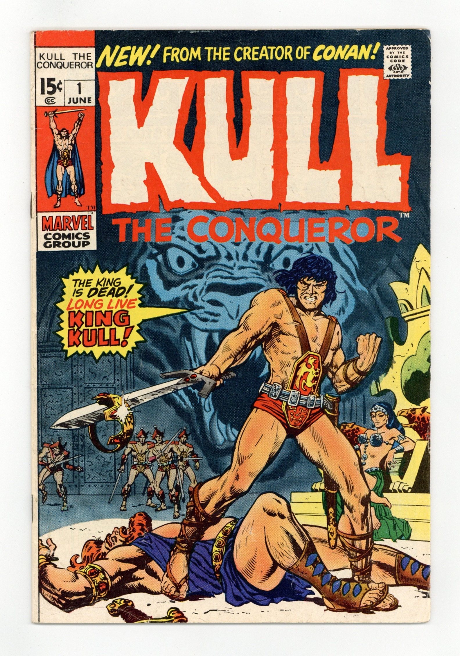 First full comic book appearance of Kull (he has a cameo in Conan the Barbarian 1 and a 7-page story in Creatures on the Loose 10). "A King Comes Riding." Script by Roy Thomas, pencils by Ross Andru, inks by Wally Wood. First appearance of Brule the Spear-Slayer. Adapted in part from "The Shadow Kingdom," "By This Axe I Rule," and "Exile of Atlantis" (Kull stories by creator Robert E. Howard). Cover pencils by Ross Andru and Sal Buscema; cover inks by Marie Severin. Cover price $0.15.