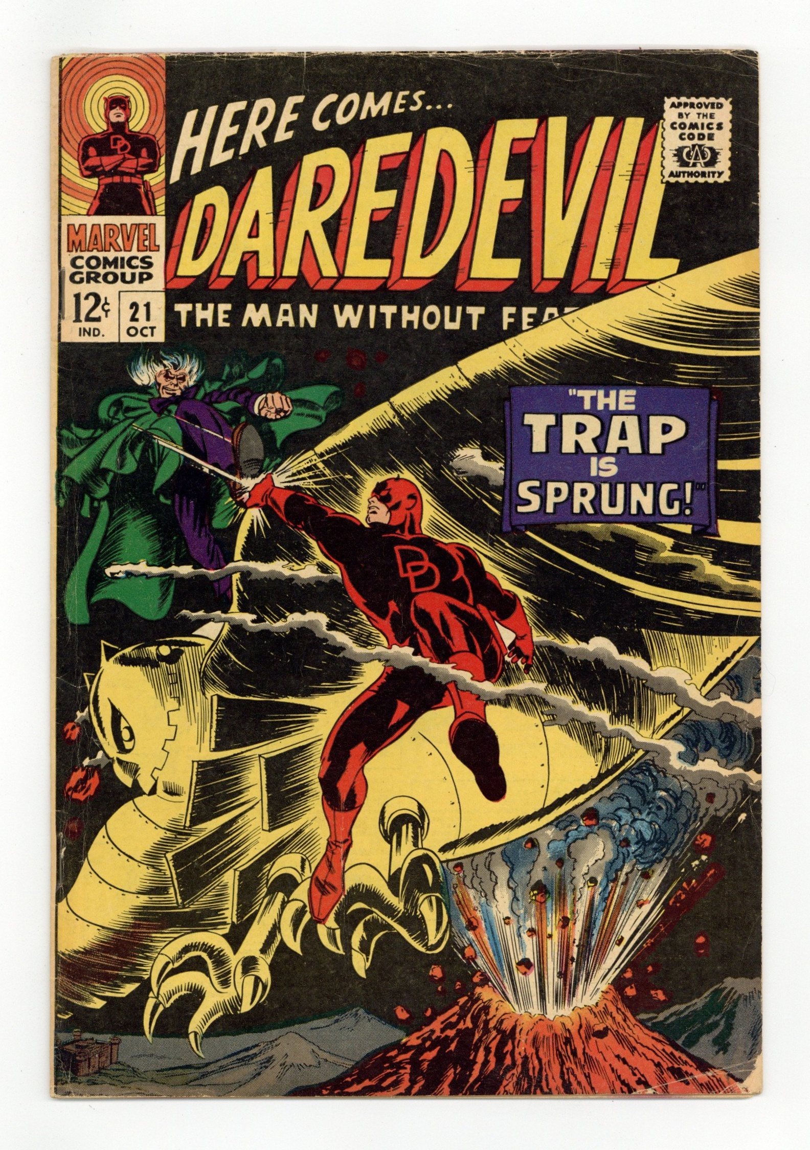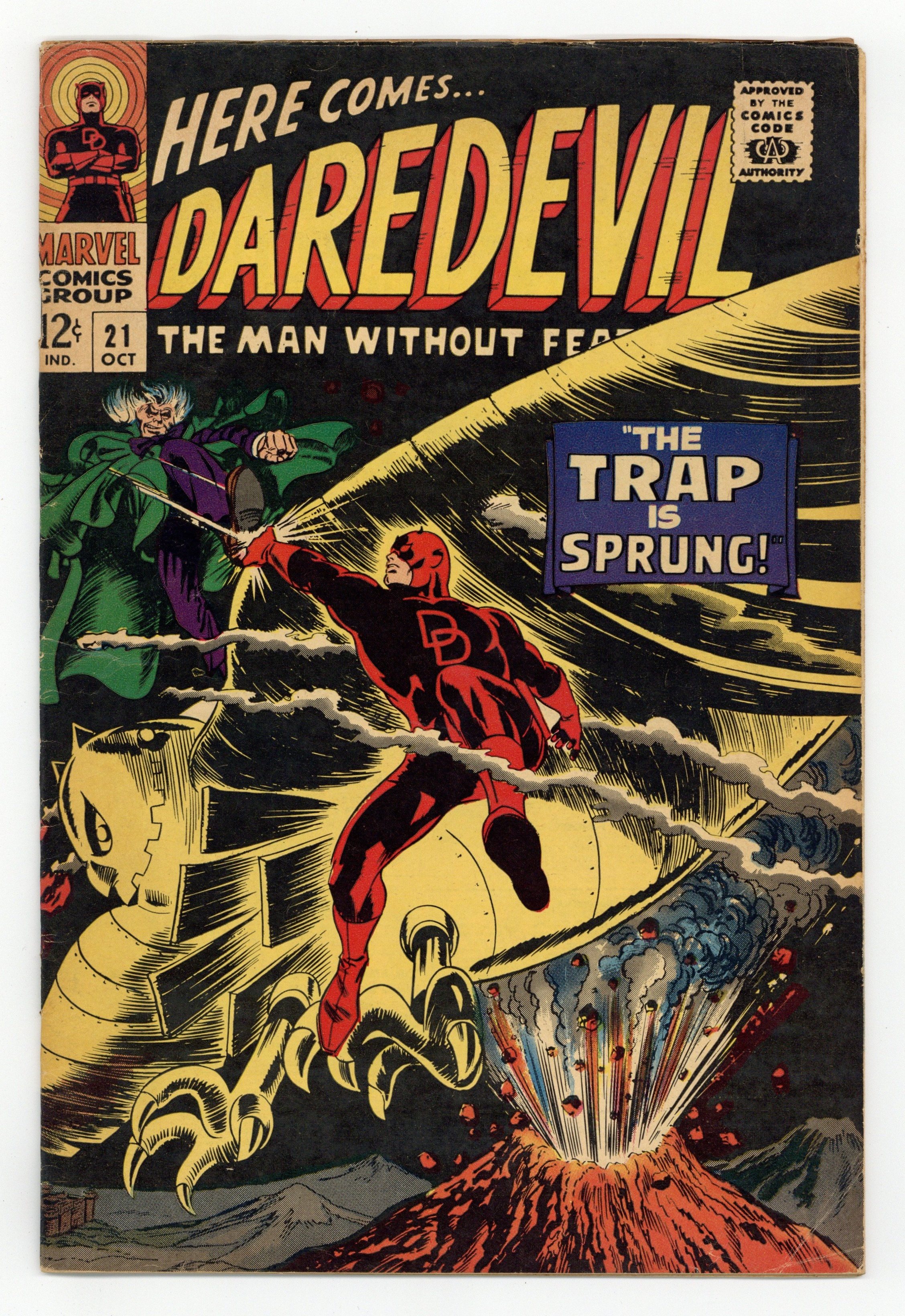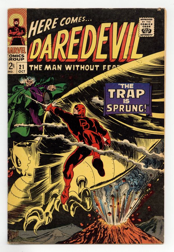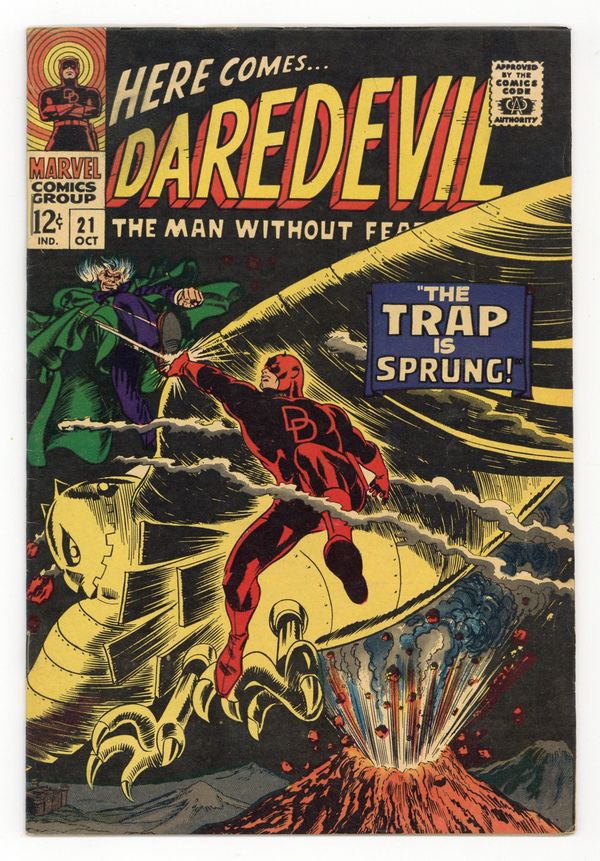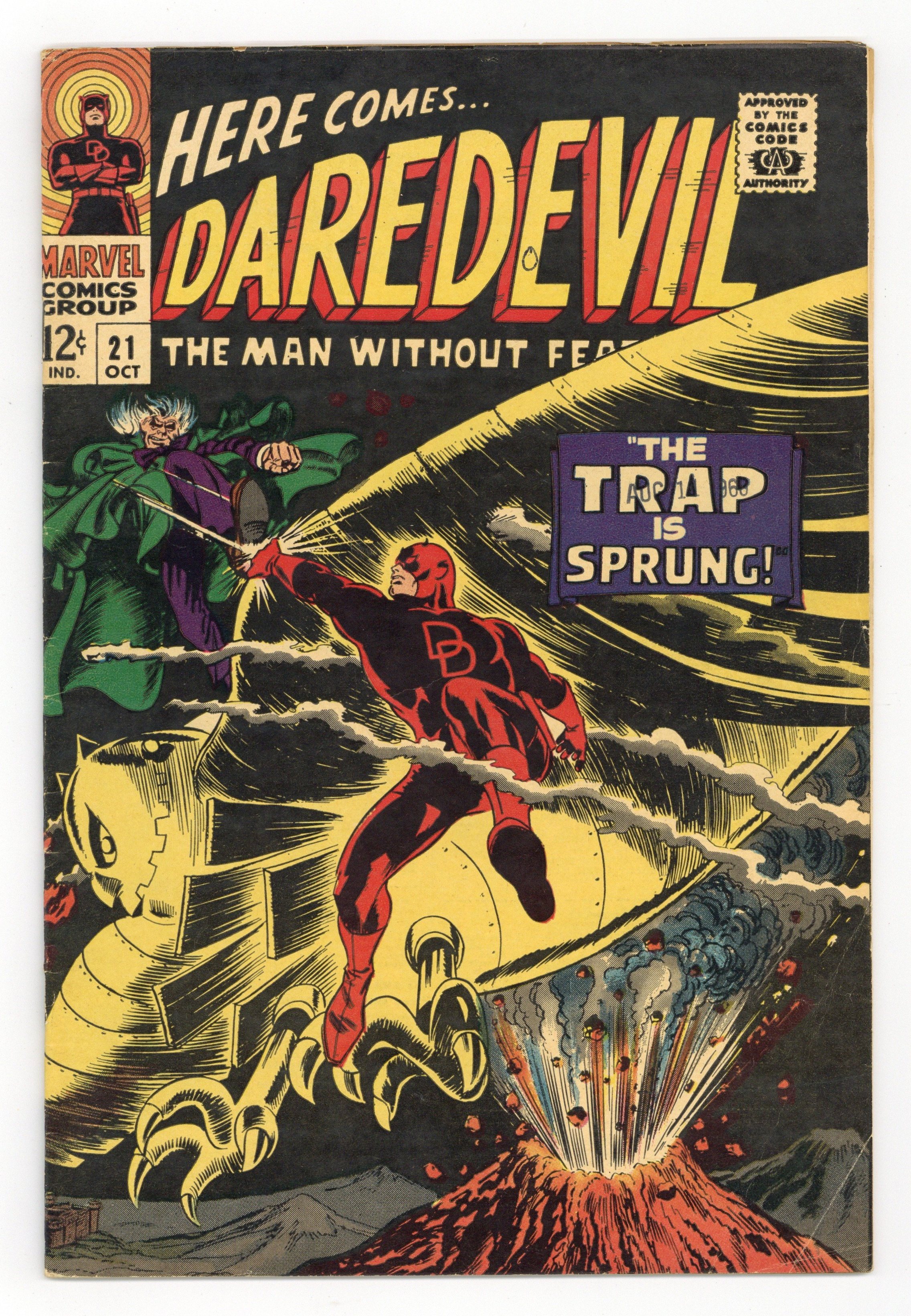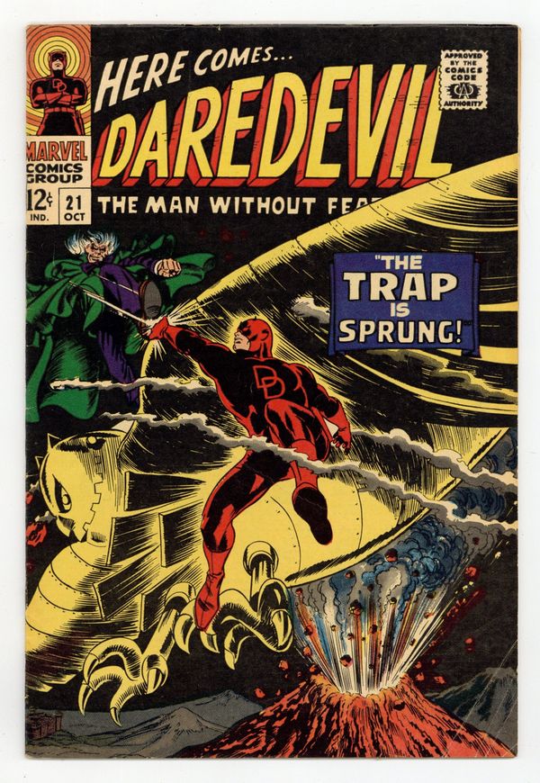 Tags: Marvel Legacy Numbering: Daredevil (part 21), Daredevil$20.00"The Trap is Sprung" Written by Stan Lee. Pencils by Gene Colan. Inks by Frank Giacoia (pages 1-3), Bill Everett (pages 4-9), and Dick Ayers (pages 10-20). Cover pencils by Gene Colan, inks by Frank Giacoia. DD has to rescue himself and Judge Lewis from the Owl's giant mechanical owl. Reprinted in Giant-Size Marvel Triple Action #2. Cover price $0.12.