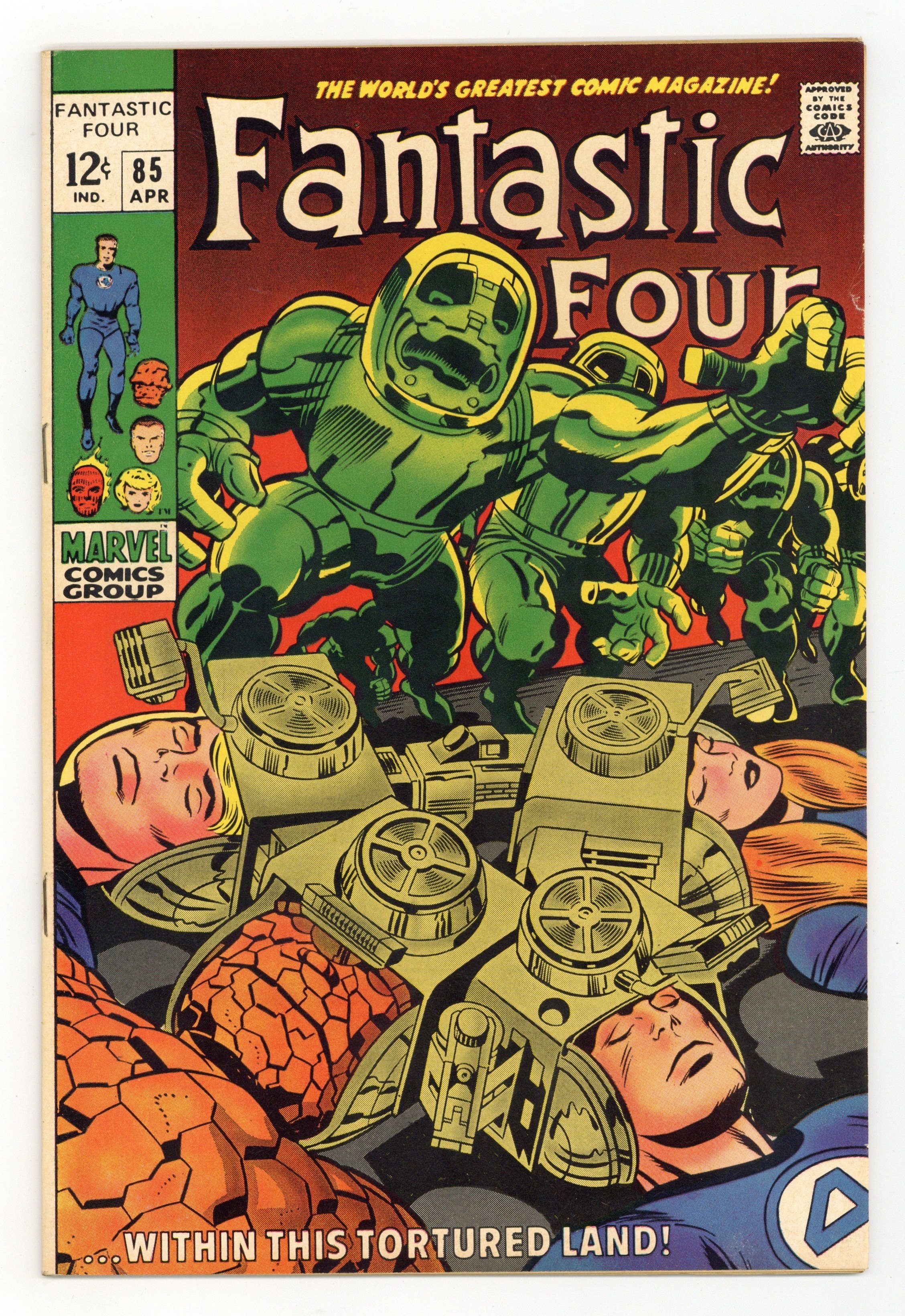 "Within this Tortured Land" Part 2 of 4. Script by Stan Lee. Pencils by Jack Kirby. Inks by Joe Sinnott. Cover by Jack Kirby and Joe Sinnott. At the request of SHIELD last issue, the Fantastic Four agreed to invade Latveria and locate a high-tech army of robots! Well, the FF did successfully locate that robot army, but unfortunately also its creator…Doctor Doom! And now Reed, Ben, Johnny, and Crystal are powerless prisoners of the Latverian monarch! Does SHIELD need any more favors?! Let's hope not! However, this isn't Mr. Fantastic's first rodeo in Latveria! Reed has a plan to get out of this mess...doesn't he? Let's hope so, because time is running out for the citizens of Latveria! Cameo appearance by the Invisible Girl. (Notes: This issue includes a full-page ad for Captain America 112. The back page contains a statement of ownership: average print run 531,325; average paid circulation 344,865.) 36 pages Cover price $0.12.