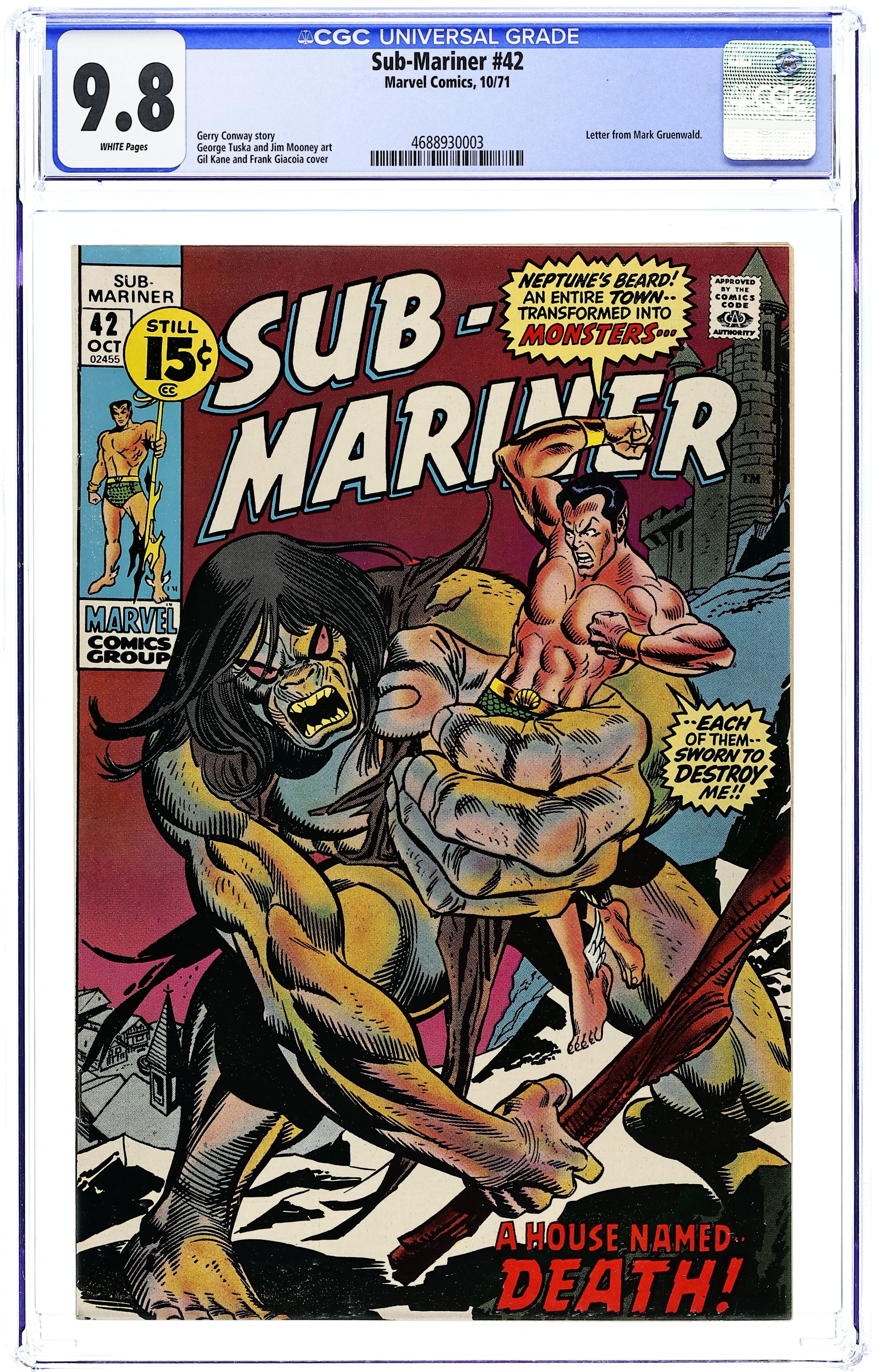 Last 15c cover-priced issue. Cover pencils by Gil Kane, inks by Frank Giacoia. "And a House Whose Name... Is Death!", script by Gerry Conway, pencils by George Tuska, inks by Jim Mooney; Namor recovers from his defeat at the hands of the transformed Lucile, but is soon attacked by other monsters from the nearby village; He quickly learns that these monsters are just more of Lucile's Aunt's victims and together they decide to attack the Aunt; Namor storms into the Aunt's house and confronts her while the villagers destroy her machinery; Lucile turns against her aunt and saves Namor from the explosion that kills them all. 36 pgs., full color. $0.15. Cover price $0.15.