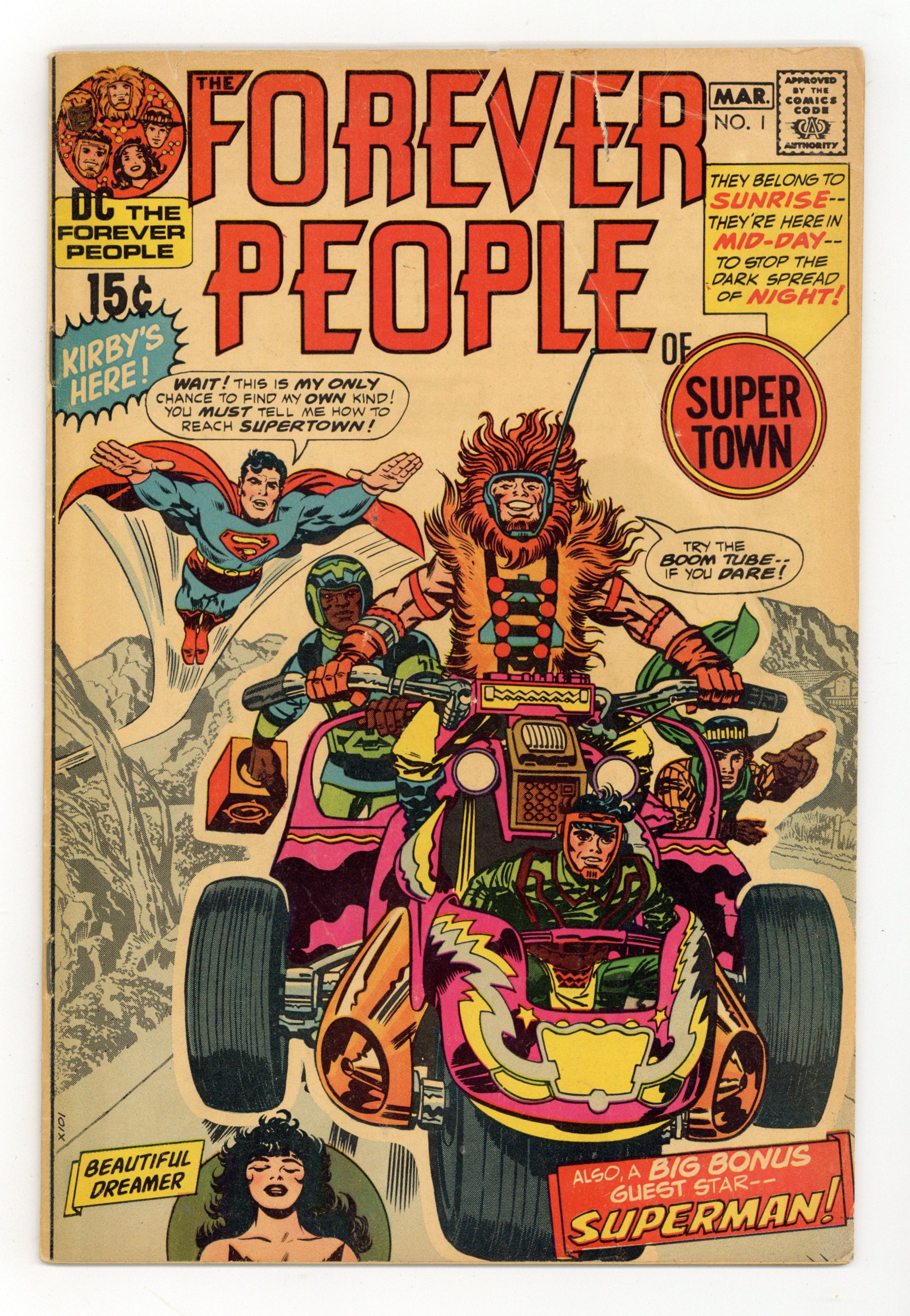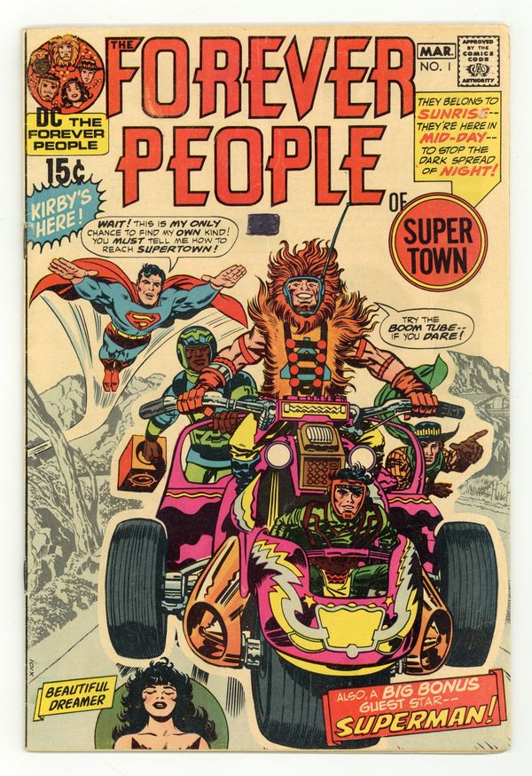 1st full appearance of Darkseid (his 3rd appearance anywhere). Superman guest stars--Odd fact: DC didn't like Kirby's rendition of Superman in this issue, so they had another artist redraw Superman (in the standard Curt Swan fashion of the day) in every panel of the comic! Cover pencils by Jack Kirby, inks by Frank Giacoia; The Forever People come to earth and are greeted by Superman. A Visit with Jack Kirby by Marv Wolfman. 36 pgs. $0.15. Cover price $0.15.