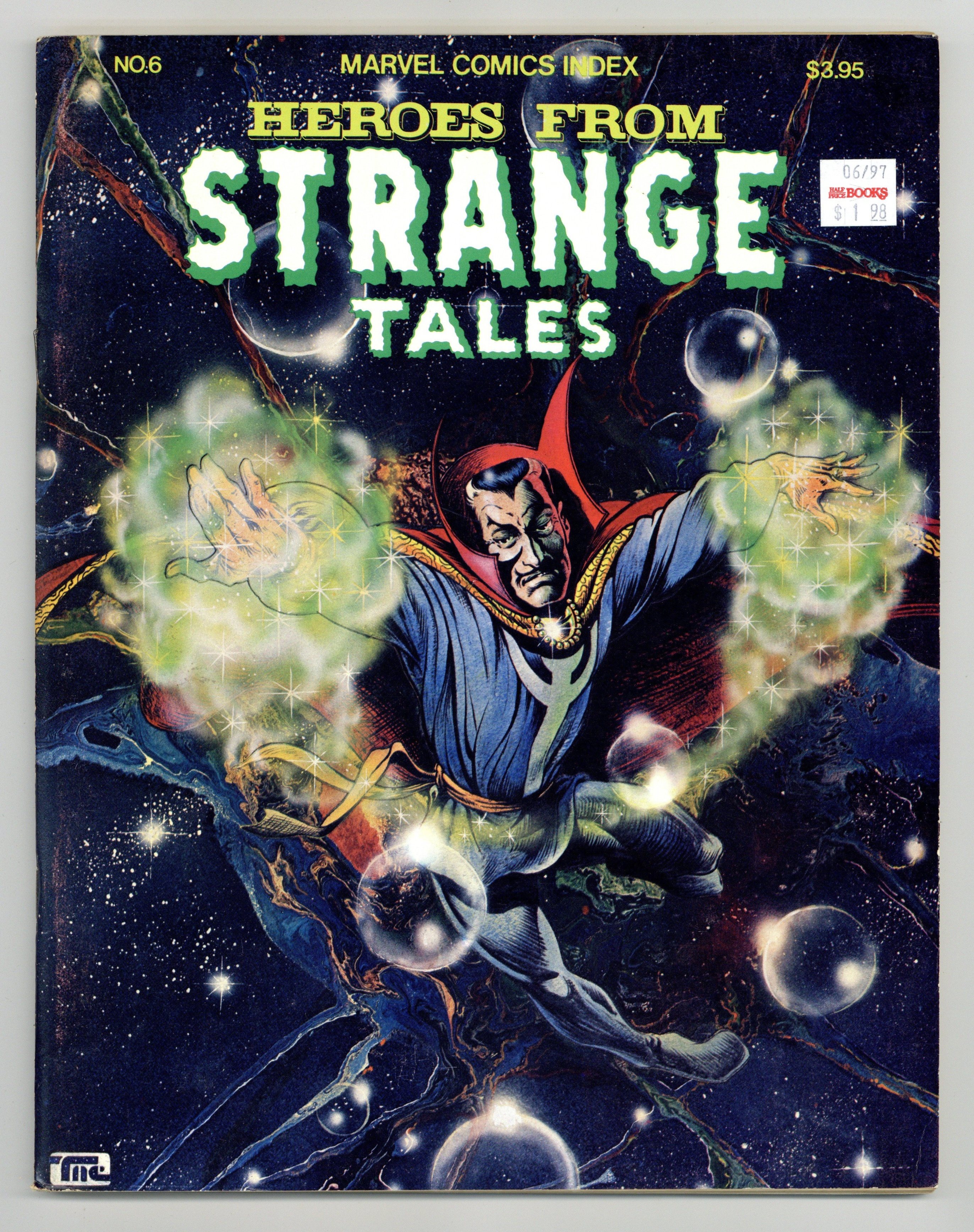 Magazine series devoted to indexing Marvel Comics Series with synopsis of each title, and info (picture of cover, date, story title, art & writing credits, character appearances and other comments) on each issue of the series. Also Includes a list of crossover appearances. THIS ISSUE covers Heroes from Strange Tales. Bill Everett/Dean Motter cover. Synopsis of Doctor Strange. Notes on Strange Tales. Strange Tales # 1,25,74,75,77,79,89,101-188, & Annuals # 1-2. Doctor Strange (1st) # 169-183. (2nd) # 1-27, & annual # 1 & Giant Size # 1. Nick Fury Agent of Shield # 1-18. Shield # 1-5. Warlock # 1-15. Personnel & Major Character cross reference indexes. Cover price $3.95.