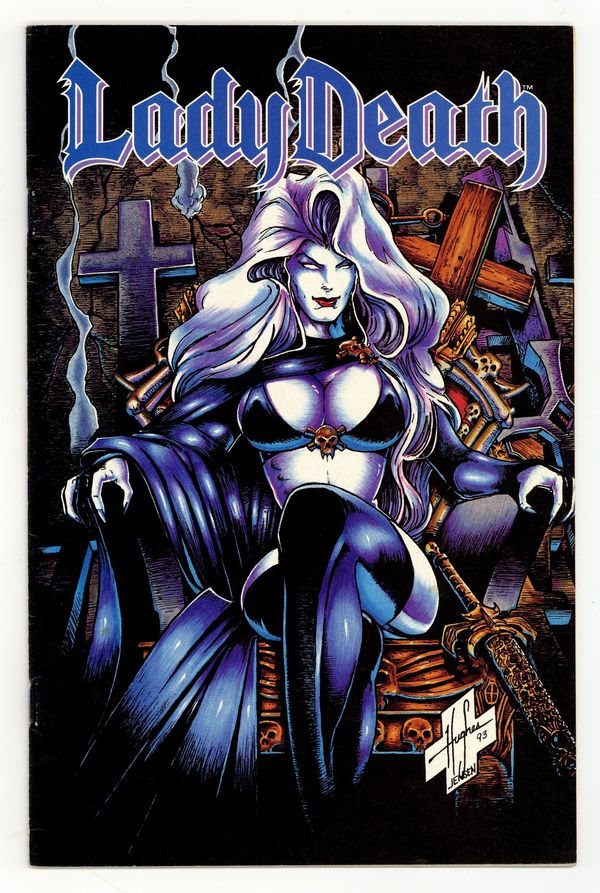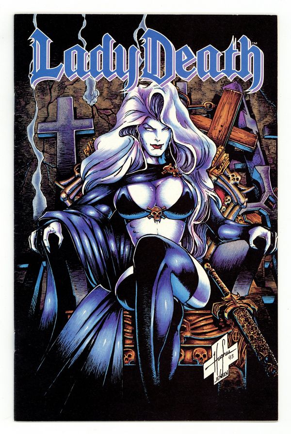 $11.50Cover by Steven Hughes. "Descent Into Hell," script by Brian Pulido, art by Steven Hughes; Lady Death continues to recount her origin; As the girl named Hope, she attempts to save herself from being burned at the stake by making a deal with hell; She is transported to hell herself and becomes caught in the middle of a battle between her father and Lucifer. Lady Death illustration by Louis Small Jr. Full page cover art for next issue by Hughes. 36 pgs., full color. $3.75. Cover price $2.75.