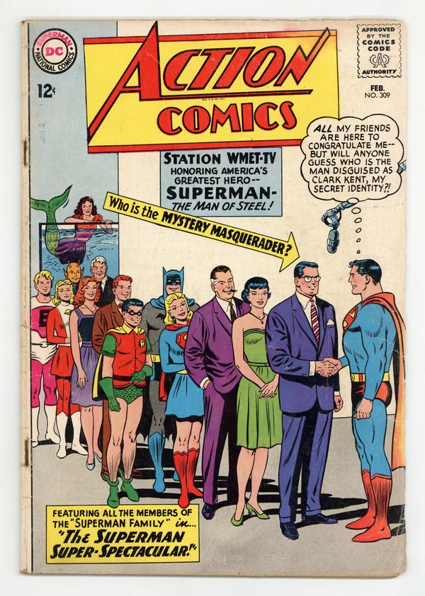 Tags: Superman$64.00Cover pencils by Curt Swan, inks by Sheldon Moldoff. John F. Kennedy appears in "The Superman Super-Spectacular!", script by Edmond Hamilton, pencils by Curt Swan, inks by George Klein; The television show "Our American Heroes" gathers many of Superman's friends for a surprise tribute; Lois and Lana are sure that Clark Kent will not appear; Later, Superman thanks President John F. Kennedy for disguising himself as Clark; cameo appearances by Batman, Robin, and the Legion of Super-Heroes.. One-page Super-Turtle story by Henry Boltinoff. "The Untold Story of Argo City!", script by Leo Dorfman, art by Jim Mooney; Supergirl learns that her parents survived the destruction of Argo City and that they are still alive in the Survival Zone, though she cannot reach them. 36 Pages, Full Color. $0.12 Cover price $0.12.