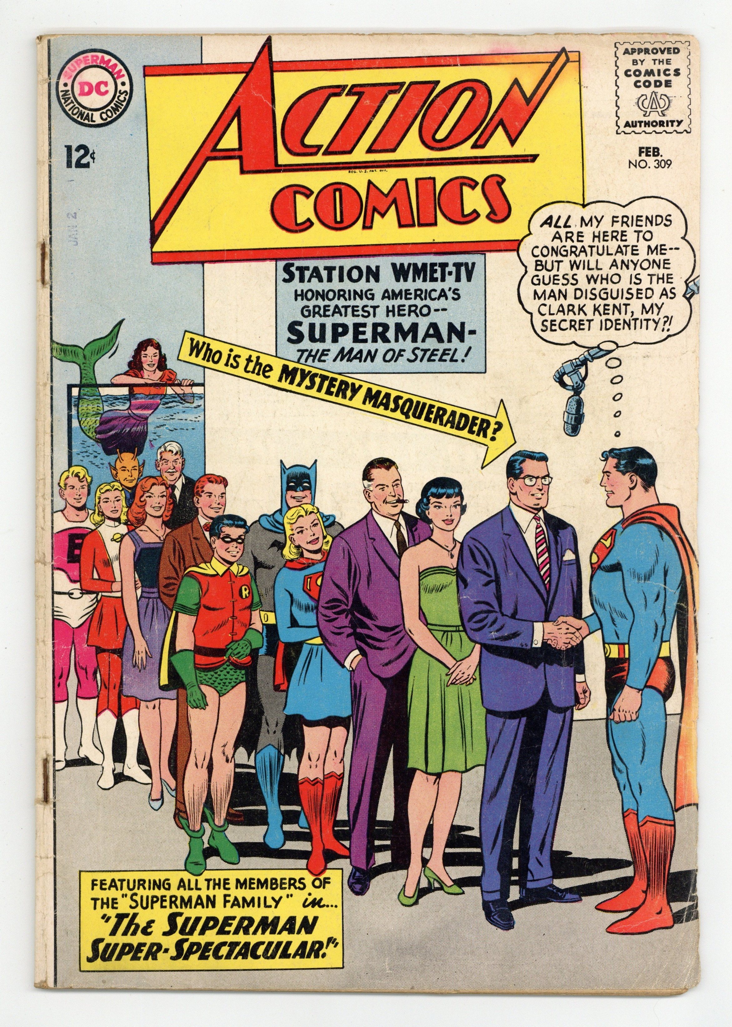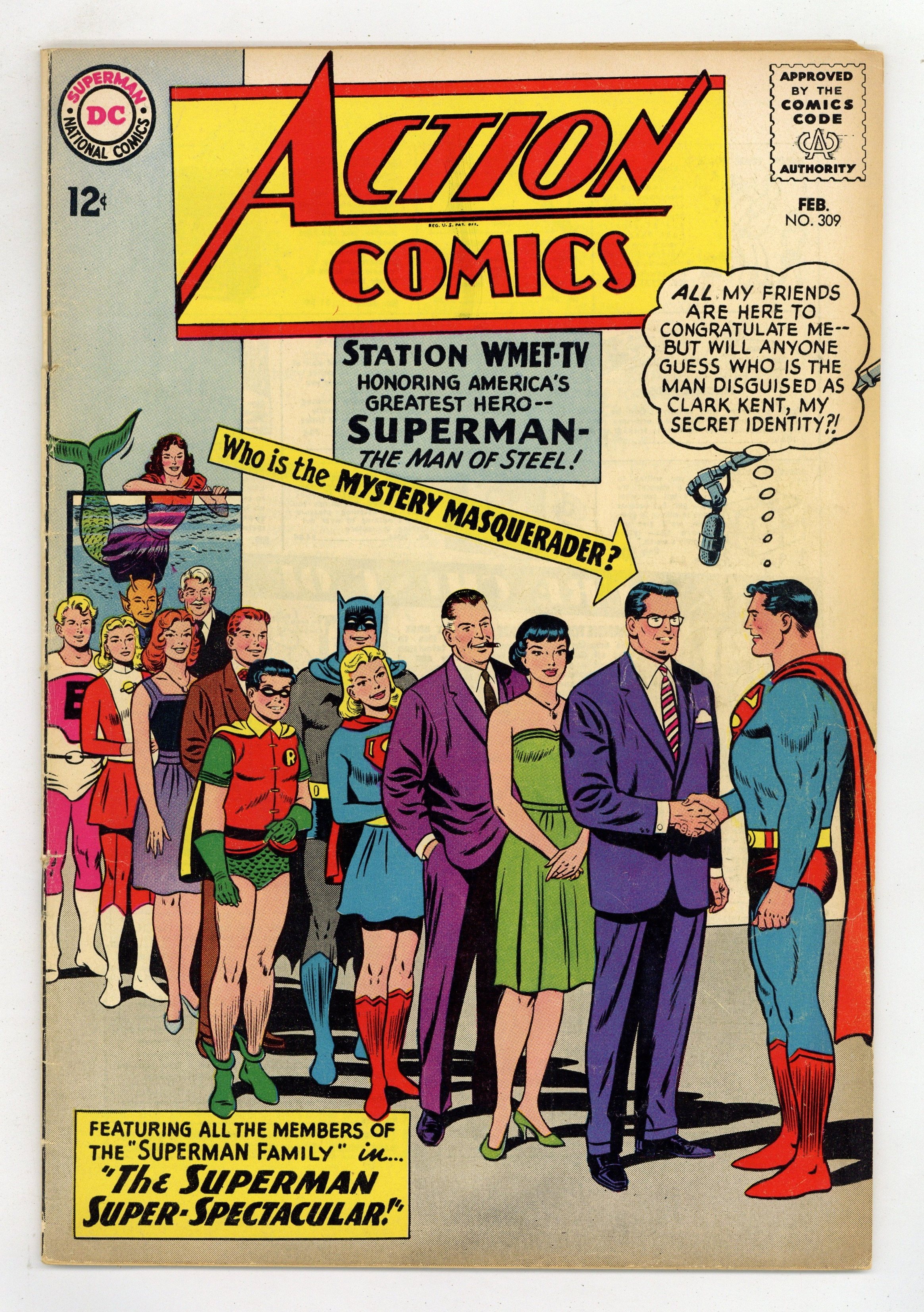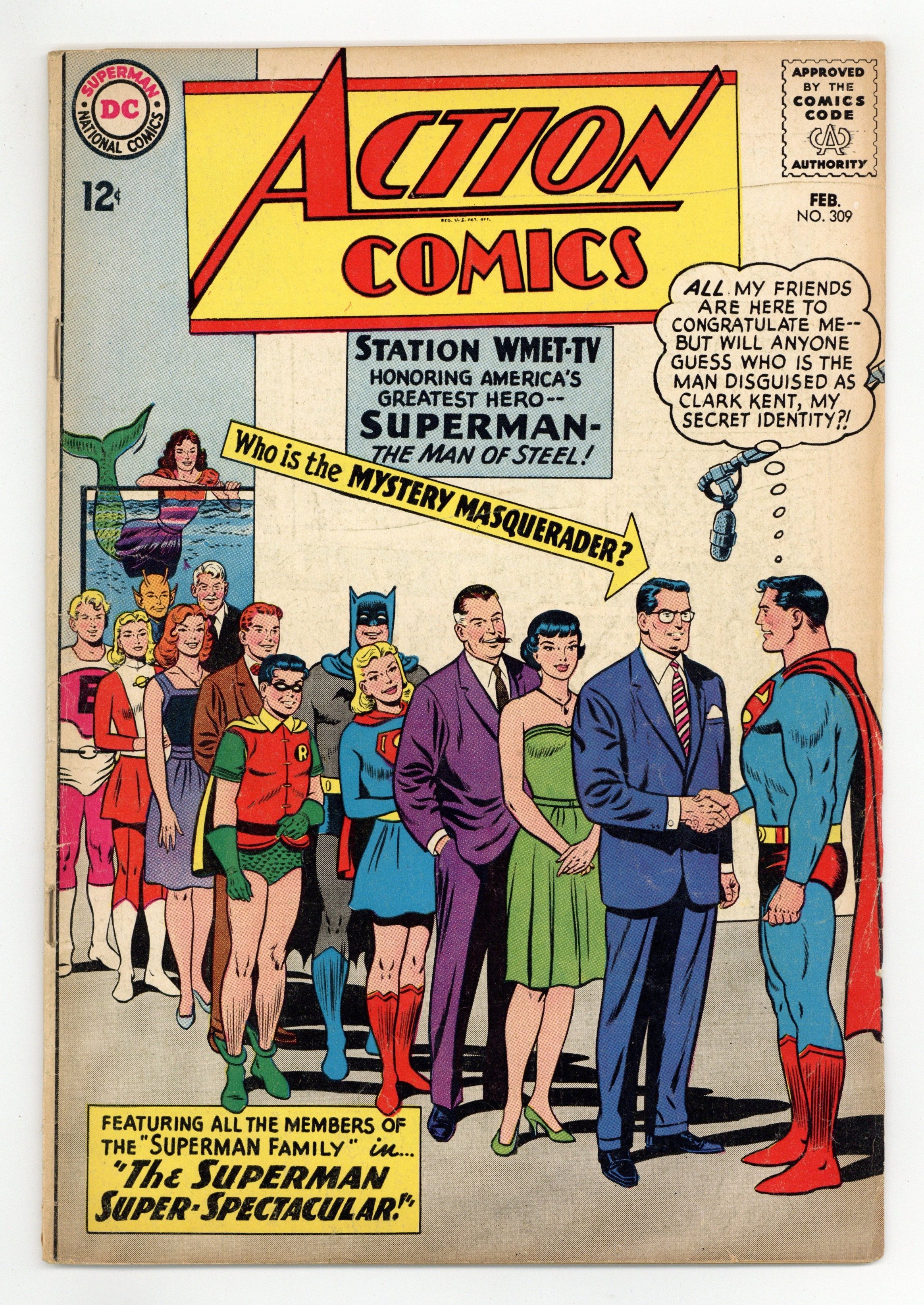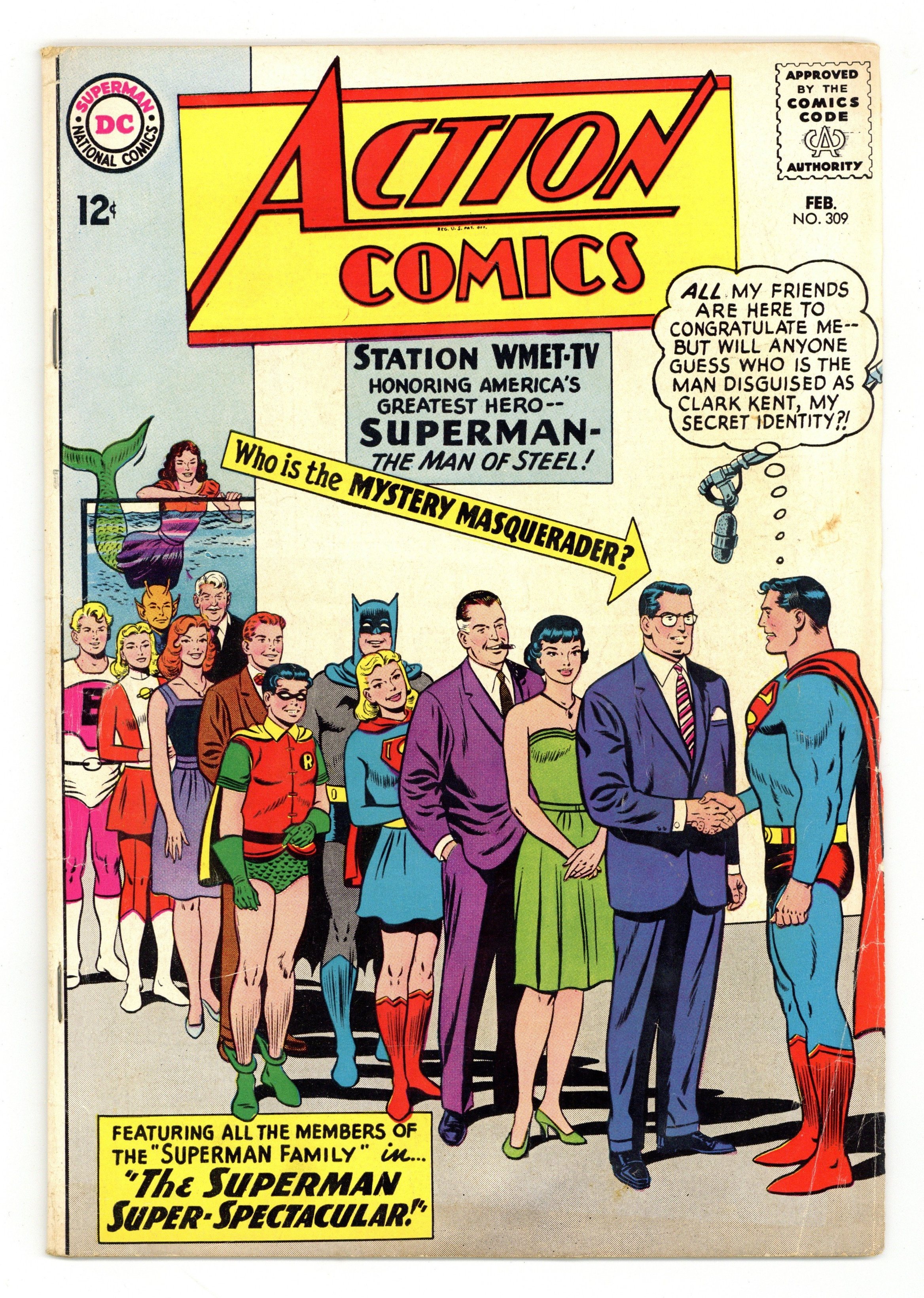Cover pencils by Curt Swan, inks by Sheldon Moldoff. John F. Kennedy appears in "The Superman Super-Spectacular!", script by Edmond Hamilton, pencils by Curt Swan, inks by George Klein; The television show "Our American Heroes" gathers many of Superman's friends for a surprise tribute; Lois and Lana are sure that Clark Kent will not appear; Later, Superman thanks President John F. Kennedy for disguising himself as Clark; cameo appearances by Batman, Robin, and the Legion of Super-Heroes.. One-page Super-Turtle story by Henry Boltinoff. "The Untold Story of Argo City!", script by Leo Dorfman, art by Jim Mooney; Supergirl learns that her parents survived the destruction of Argo City and that they are still alive in the Survival Zone, though she cannot reach them. 36 Pages, Full Color. $0.12 Cover price $0.12.