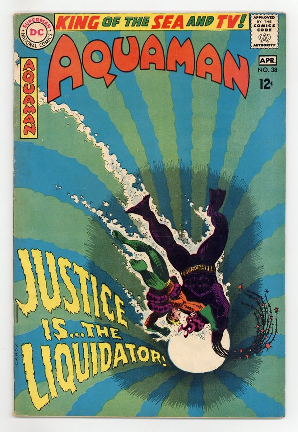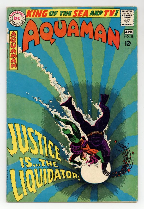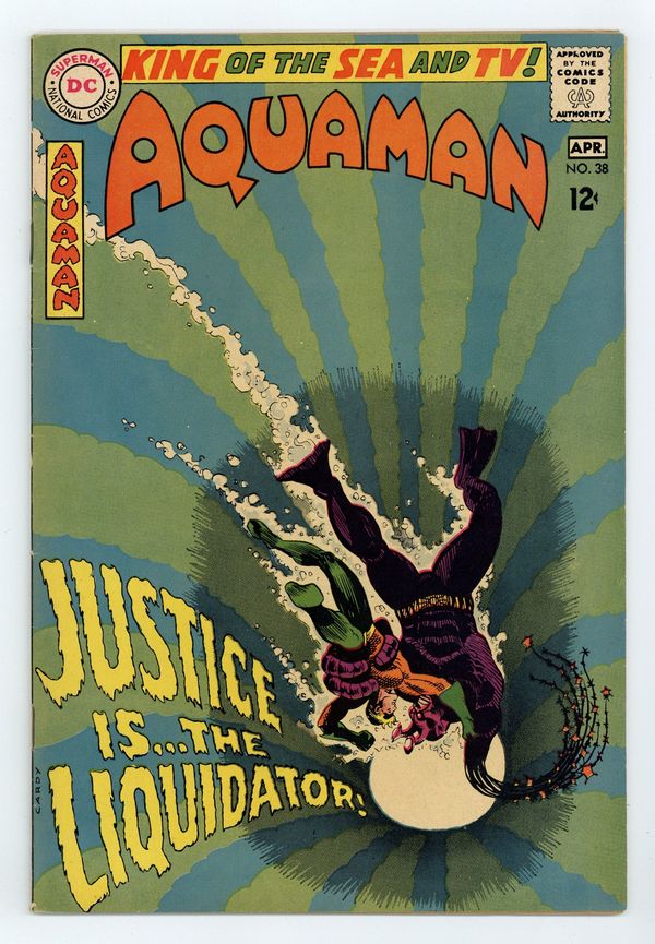 Tags: Print Run Statistics$34.00Cover art by Nick Cardy. Justice is Mine, Saith the Liquidator! starring Aquaman, Aqualad, Mera, The Liquidator, and Lord Ragnar, script by Bob Haney, art by Nick Cardy; Ragnar usurps Aquaman's throne; Aquaman battles The Liquidator; Ragnar is responsible for the attacks. Stan Goes Skin Diving humor page by Henry Boltinoff. Statement of ownership--average print run 404,000; average paid circulation 234,200. 36 pgs. $0.12. Cover price $0.12.