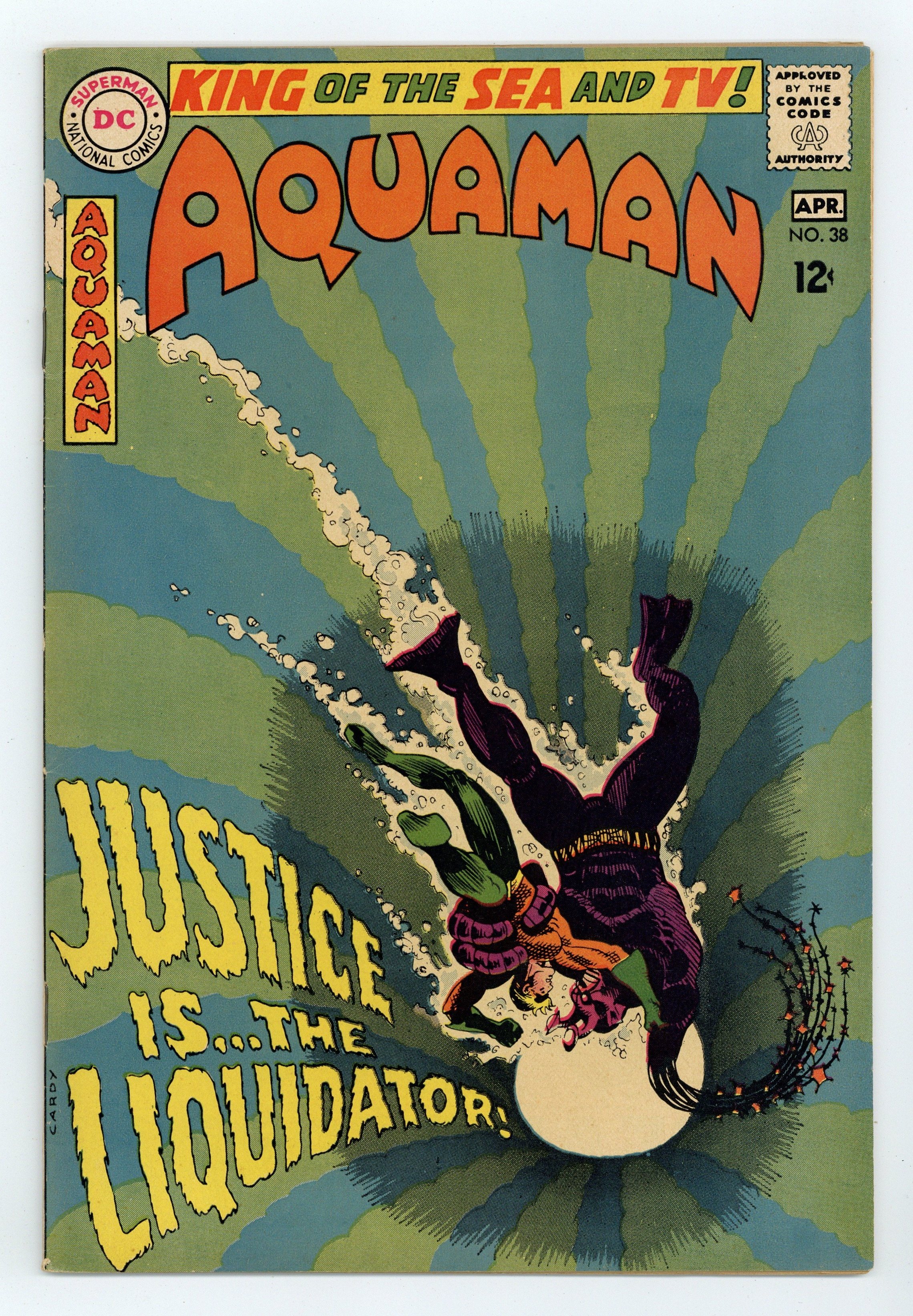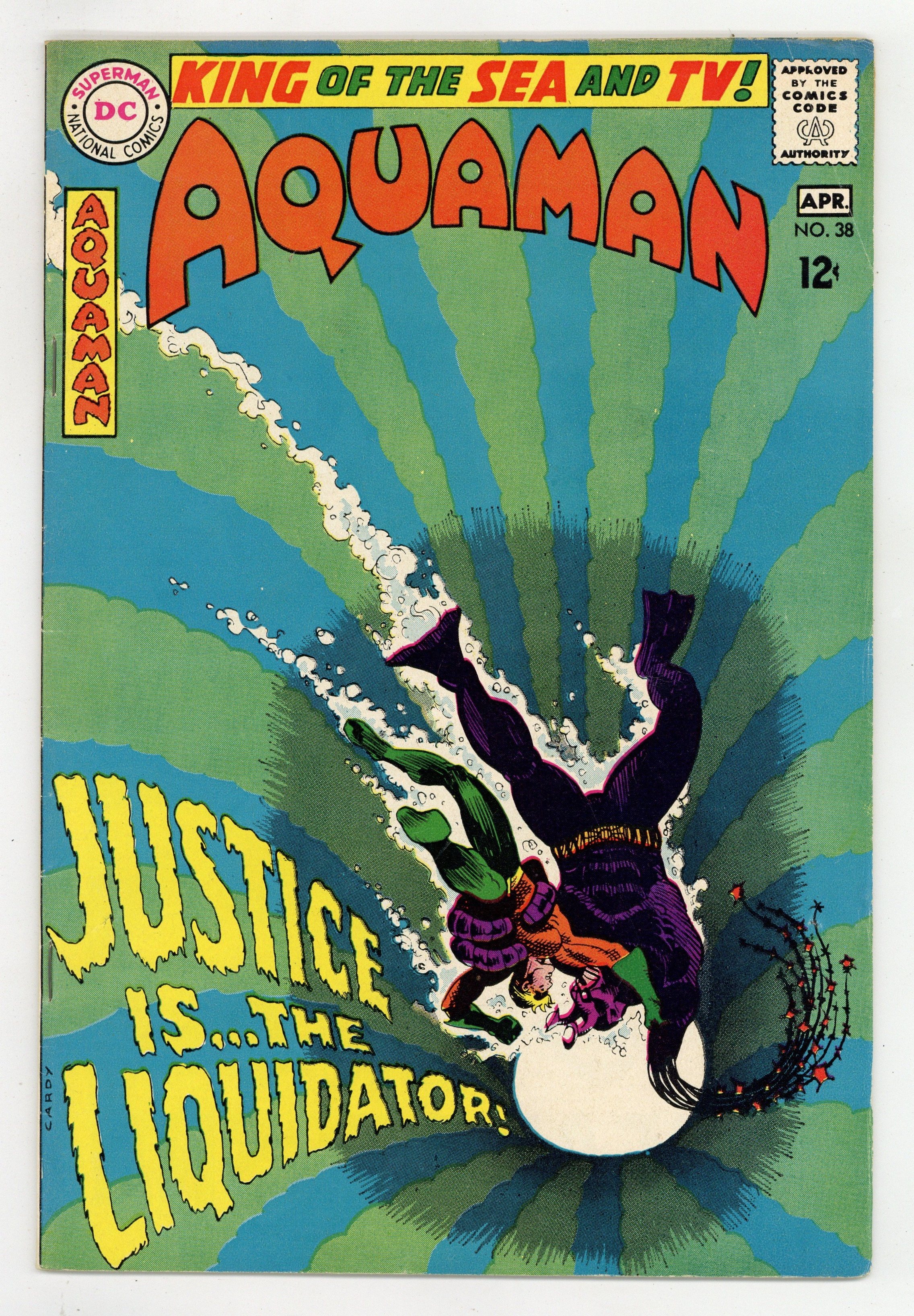 Cover art by Nick Cardy. Justice is Mine, Saith the Liquidator! starring Aquaman, Aqualad, Mera, The Liquidator, and Lord Ragnar, script by Bob Haney, art by Nick Cardy; Ragnar usurps Aquaman's throne; Aquaman battles The Liquidator; Ragnar is responsible for the attacks. Stan Goes Skin Diving humor page by Henry Boltinoff. Statement of ownership--average print run 404,000; average paid circulation 234,200. 36 pgs. $0.12. Cover price $0.12.