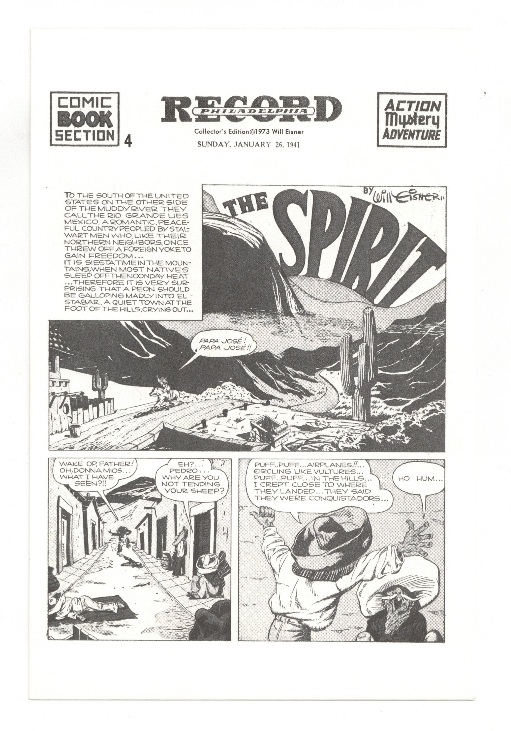 Tags: Comic Strip Reprints$3.20Limited Edition Reprint of the Spirit Weekly Newspaper Comic reprint dated January 26, 1941. Will Eisner wrote individual commentary (on the back page) for most every issue in this reprint series. 6-1/4" x 9 3/8" inches, 8 pages, b&w.