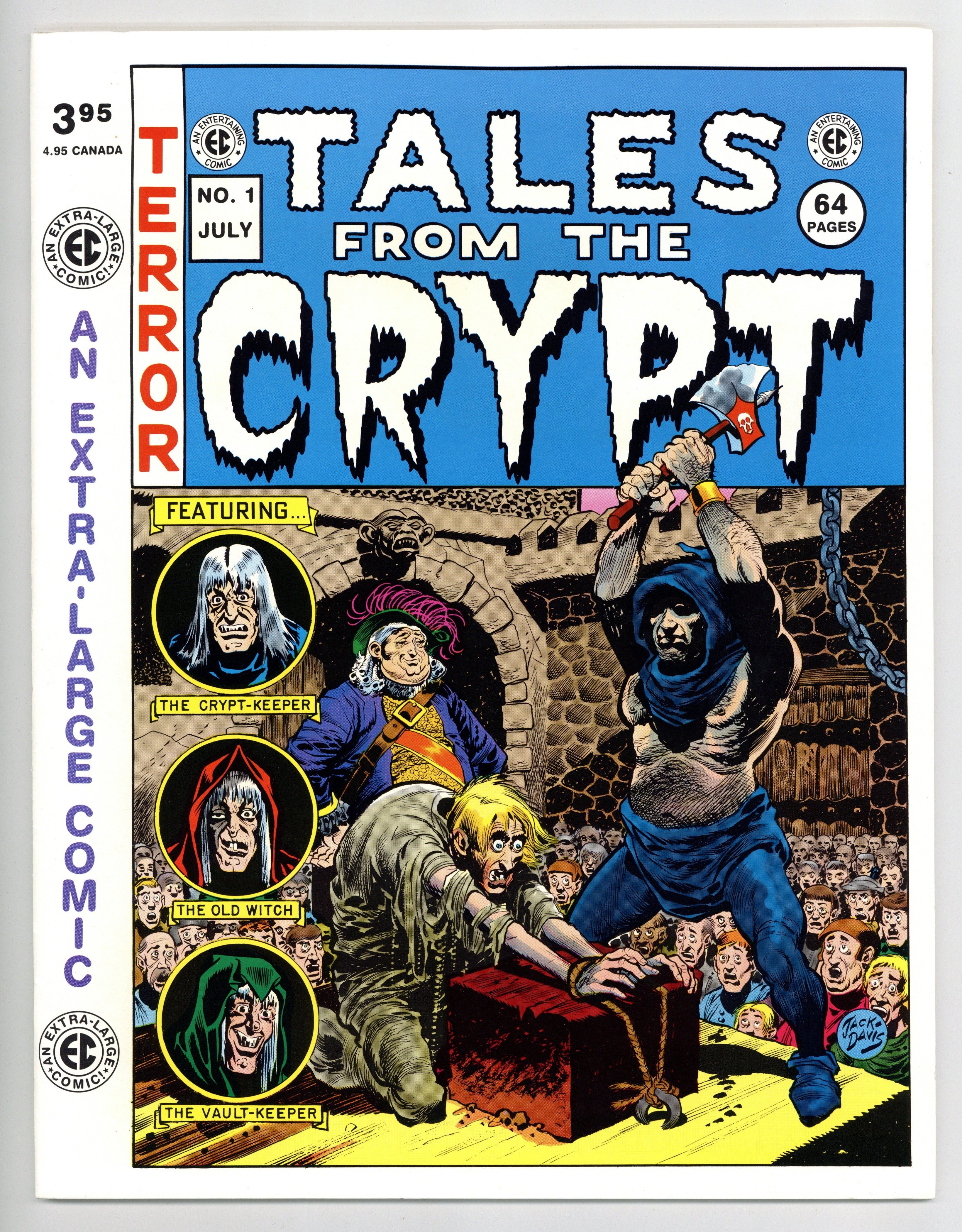 Published Jul 1991 by Russ Cochran.$22.00An Extra Large Comic - Treasury size. 1991-92 Russ Cochran reprint series. Cover by by Jack Davis. This series can easily be confused with the original series (10c cover priced), the 1990-91 Gladstone reprint series, or 1992-99 RC/Gemstone reprint series. This edition reprints "Survival or Death" (art by Jack Davis), "The Thing in the Glades" (art by Al Williamson), "Kamen's Kalamity" (art by Jack Kamen), "Buried Treasure" (art by Graham "Ghastly" Ingels), "The Execution" (art by Johnny Craig), "Murder the Lover/Murder the Husband" (art by Jack Davis), "Snooze to Me" (art by Kamen), and "Paralyzed" (art by Ingels). Newsprint, 10.25-in. x 13.25-in., 64 pages, Full Color. Cover price $3.95.