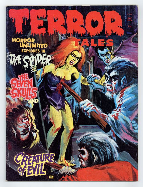 Cover by Carl Burgos. Stories and art by Enrique Cristobal, Oscar Fraga, Larry Woromay and Dick Ayers. Legendary publisher Myron Fass presents gory tales of horror and the macabre. A fraternity initiation prank goes terribly wrong. A murdered circus clown returns from the grave as the Phantom Clown to save his circus, in a special bonus story for clownophobes. A female ghoul must choose between two handsome vampire brothers. Featuring altered reprints from Chamber of Chills and other 1950s pre-Code comics. Spider; The Seven Skulls; Creatures of Evil; The Devil's Zombie; The Witch's Claws; Sawdust Banshee; Vampire-Ghouls. 8 1/2-in. x 11-in., 48 pages, B&W. Mature readers. Cover price $0.75.