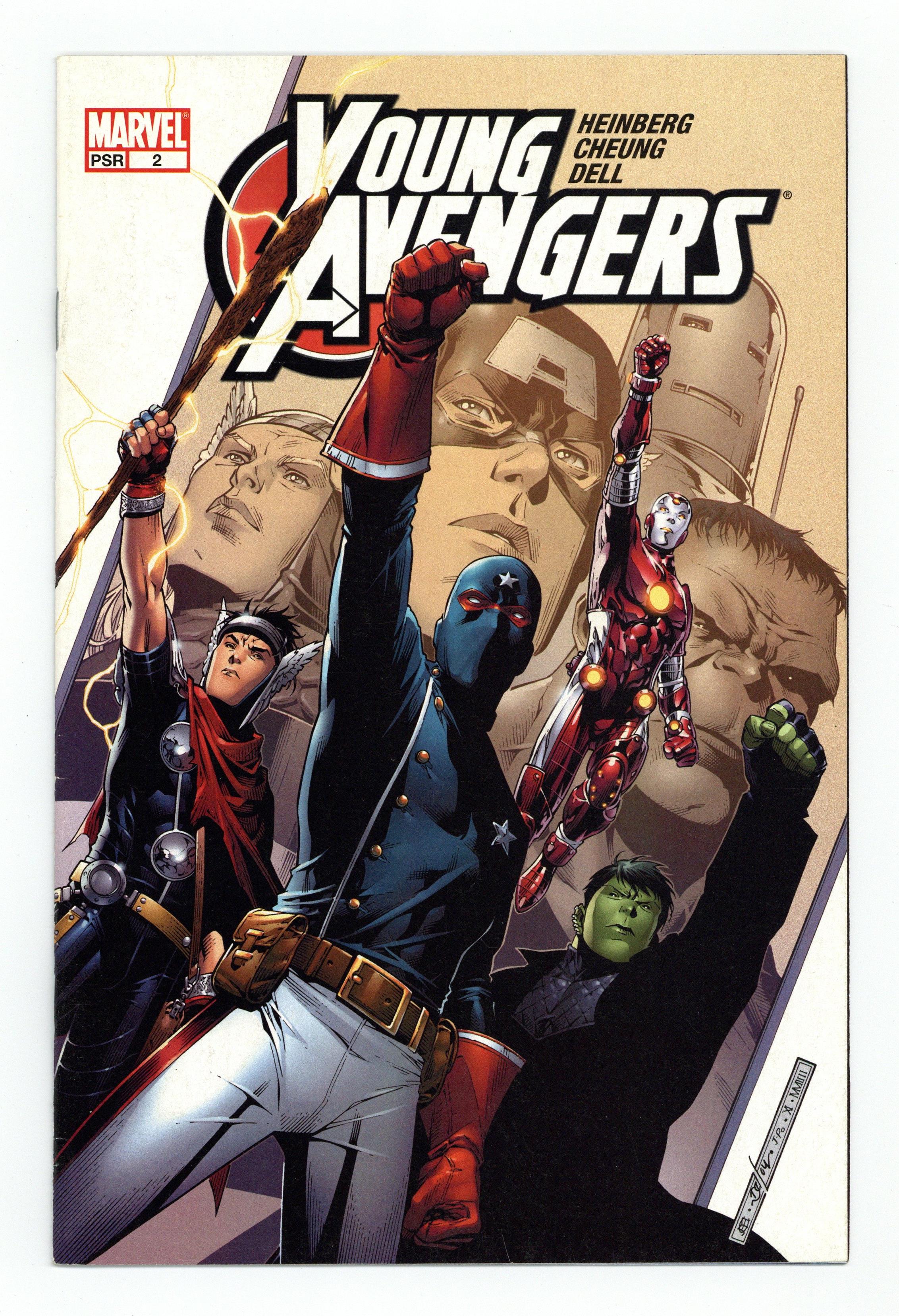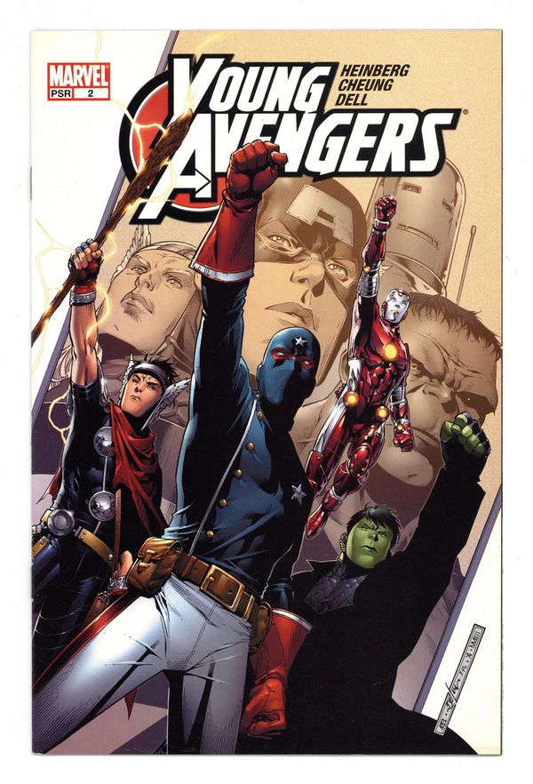 Written by Allan Heinberg Pencils & Cover by Jim Cheung Captain America, Iron Man, and Jessica Jones learn the secret origin of Iron Lad. Patriot leaves the team to go solo. And a familiar face shows up to demand a place on the team. 32 PGS./Marvel PSR Cover price $2.99.
