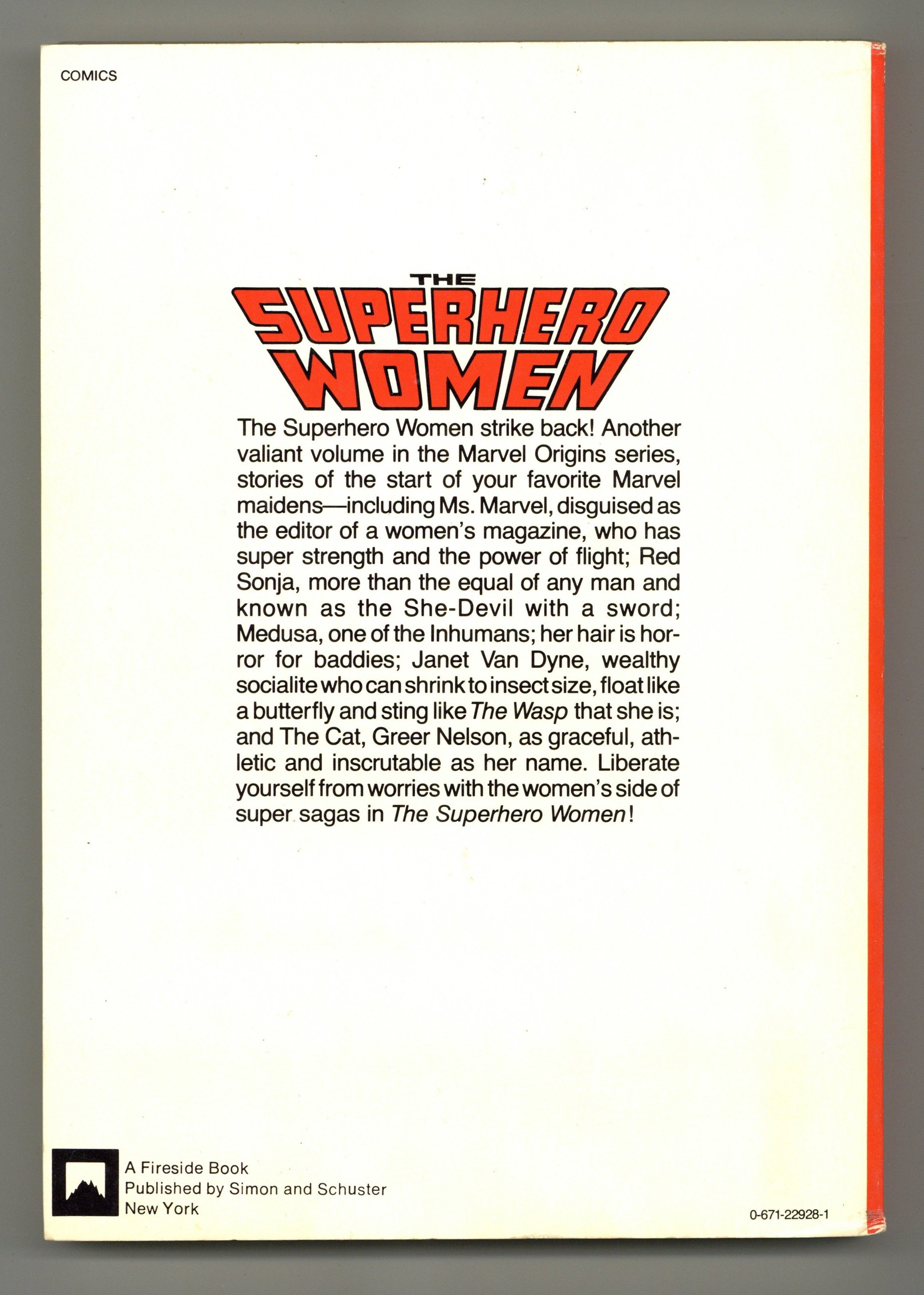 This volume in the amazing Marvel Origins series (Origins of Marvel Comics, Son of Origins TPB, Bring on the Bad Guys TPB) stars the beautiful Marvel Maidens - Ms. Marvel, Kree powered super-woman; Red Sonja, She-Devil with a Sword; Medusa of the Inhumans; Hela, Norse Goddess of the Underworld; Shanna the She-Devil; the Wasp from the Avengers, the Invisible Woman, heart and soul of the Fantastic Four; and the Black Widow.