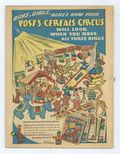 Published 1946 by General Foods Corp..$23.00Undamaged, uncut copies are extremely rare. Most copies were destroyed by children as they completed the many activities (cut-outs, etc.) offered. Post's Cereals 3 Ring Circus was a promotional activity comic with only one actual comic page, "From Jungle to Circus," as told by Jim Rogers, animal trainer. It was distributed in 1946 by General Foods Corporation. Full color, all newsprint, 32 pages, 6-1/4-in. x 8-1/4-in, no cover price.