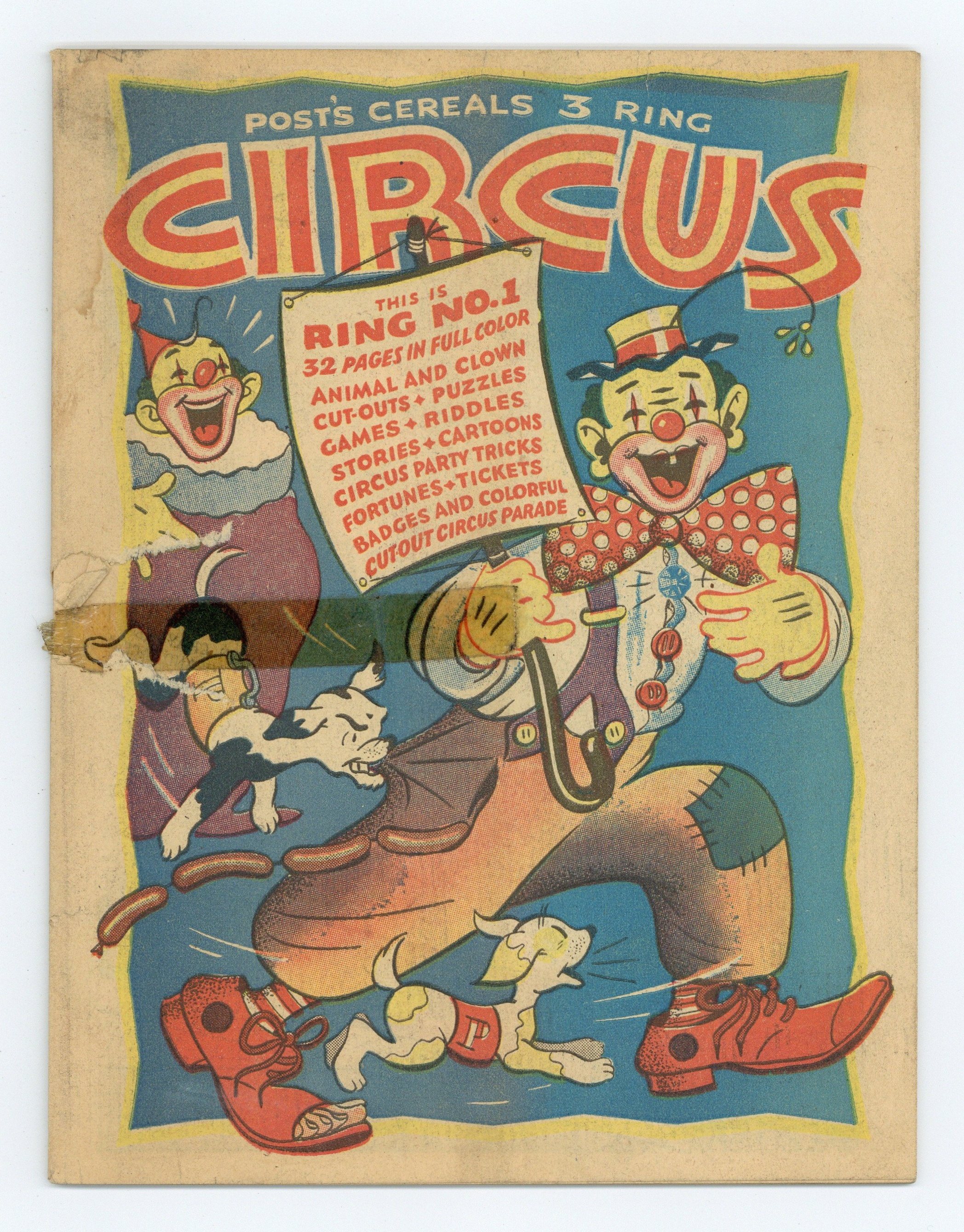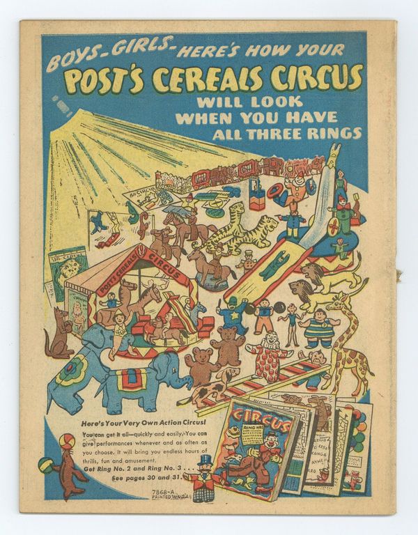Published 1946 by General Foods Corp..$27.00Undamaged, uncut copies are extremely rare. Most copies were destroyed by children as they completed the many activities (cut-outs, etc.) offered. Post's Cereals 3 Ring Circus was a promotional activity comic with only one actual comic page, "From Jungle to Circus," as told by Jim Rogers, animal trainer. It was distributed in 1946 by General Foods Corporation. Full color, all newsprint, 32 pages, 6-1/4-in. x 8-1/4-in, no cover price.