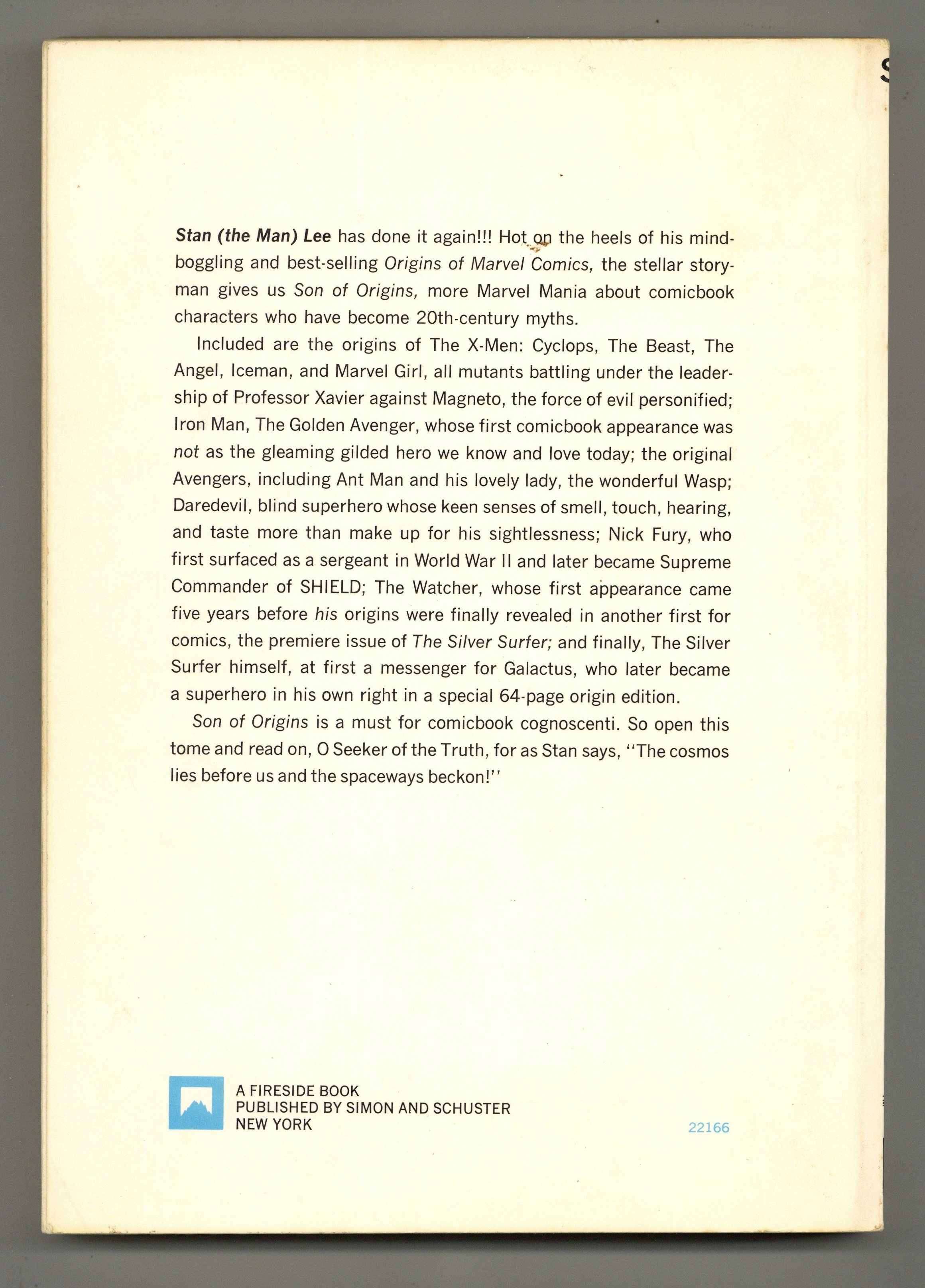 Tags: Fireside Book (part SC), Anthology / Collection, Avengers, Comic History, Daredevil, Fantastic Four, Galactus, Iron Man, Nick Fury, SHIELD, Silver Surfer, X-Men$33.00- 1" spine split from bottom.