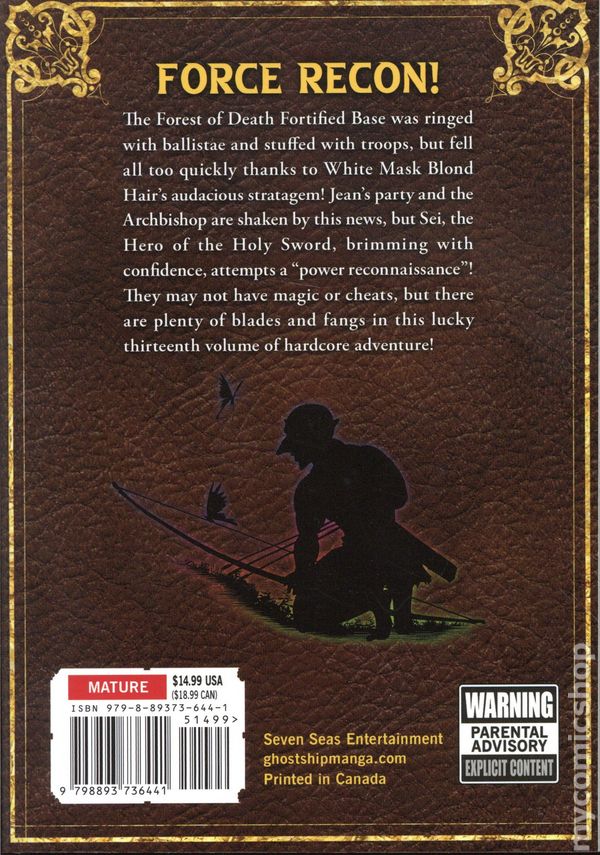Volume 13 - 1st printing. Story and art by Kakeru. Translated by Ethan Cook. FORCE RECON! The Forest of Death Fortified Base was ringed with ballistae and stuffed with troops, but fell all too quickly thanks to White Mask Blond Hairs audacious stratagem! Jeans Party and the Archbishop are shaken by this news, but Sei, the Hero of the Holy Sword, brimming with confidence, attempts a power reconnaissance! They may not have magic or cheats, but there are plenty of blades and fangs in this lucky thirteenth volume of hardcore adventure! Softcover, 5-in. x 7-in., 178 pages, B&W. Mature Readers Cover price $14.99.