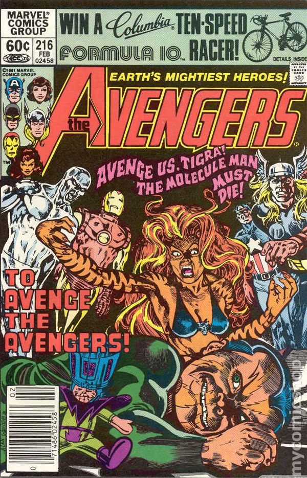 Newsstand Edition. "To Avenge the Avengers!" Part 2 of 2. Guest-starring the Silver Surfer. Script by Jim Shooter. Pencils by Alan Weiss. Inks by Dan Green. Cover by Alan Weiss. In stunning fashion the Avengers and the Silver Surfer have gone down to defeat at the hands of the Molecule Man! Now only Tigra remains to confront the misguided maniac! However, Owen Reece appears to be lost in his own little world and allows the Avengers to regroup after their near death experience. But Iron Man and Thor are out of action! It's going to be Tony Stark, Donald Blake, Captain America, Tigra, and the Silver Surfer making the final valiant stand against the Molecule Man! A terrific two-part story! Cameo appearance by the Fantastic Four. (Notes: In this issue Captain America finally learns the secret identities of Iron Man and Thor. This two-part story established the awesome power of the Molecule Man that would be featured in the Marvel Super Heroes Secret Wars Limited Series. The letters page includes a letter from comics editor Kevin Dooley.) 36 pages Cover price $0.60.