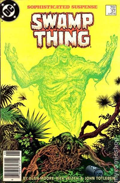 Newsstand Edition. "Growth Patterns!" Written by Alan Moore, with art by Rick Veitch and John Totleben. Cover by Stephen Bissette and Totleben. New "Growth Patterns" and other strange abilities emerge in Swamp Thing as he fights for survival. NOTE: 1st appearance of John Constantine, Hellblazer. 36 pages, full color. Cover price $0.75.