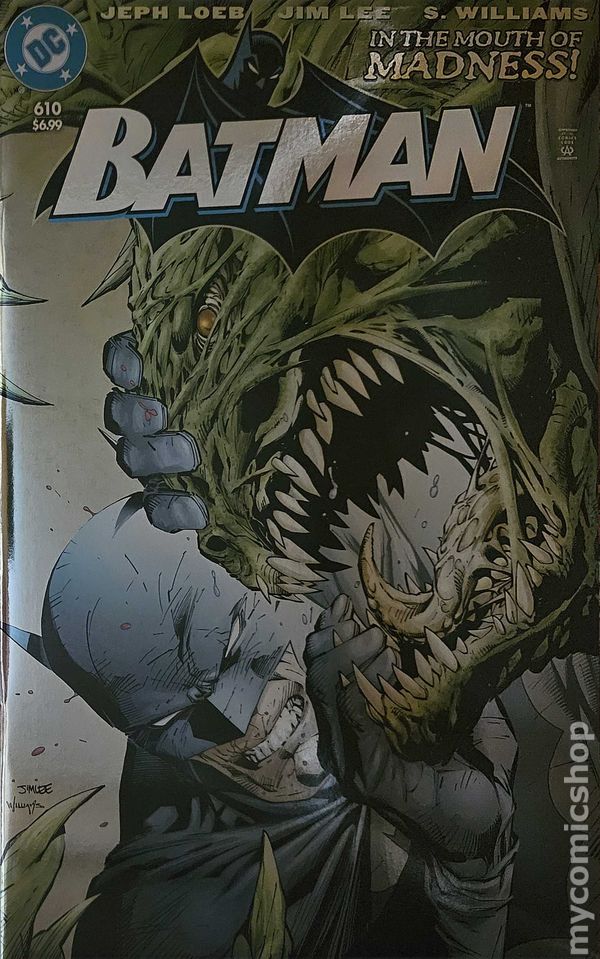 Foil Cover. Written by Jeph Loeb. Art by Jim Lee, Scott Williams. Cover by Jim Lee, Scott William. THE HUSH SAGA CONTINUES WITH FACSIMILE EDITIONS! Someone's stolen a 10-million-dollar ransom right out of the clawed hands of a desperate Killer Croc, and all signs point to a certain feminine feline. Has Catwoman returned to her old ways? Who hired Croc in the first place? The Dark Knight suspects a deadly new player may be playing everyone in chapter three of Hush! 40 pages, full color. Rated T+ Cover price $6.99.