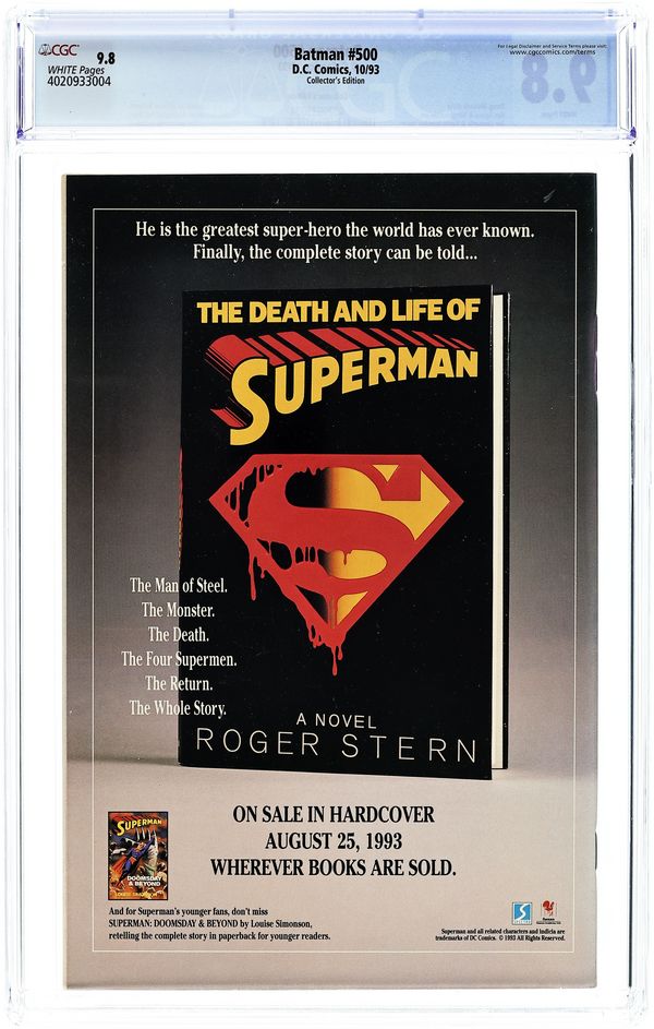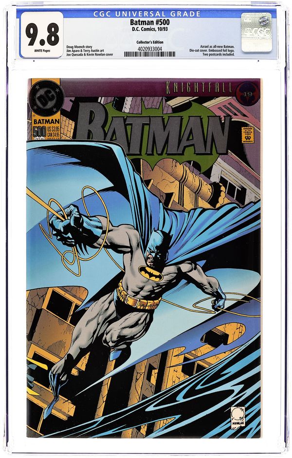 THIS COMIC IS NOT POLYBAGGED. Wraparound die-cut cover by Joe Quesada & Kevin Nowlan. KnightFall Part 19. The concluding chapter of KnightFall finds Batman (Jean-Paul Valley) determined to break Bane the way the villain broke his predecessor in "Dark Angel." Nightwing cameo. Written by Doug Moench. Art for Chapter 1 ("The Fall") by Jim Aparo & Terry Austin. Art for Chapter 2 ("The Descent") by Mike Manley. Comes with 2 postcards: 'Classic Batman' by Jim Aparo and 'The New Batman' by Mike Manley. 68 Pages, Full Color. Cover price $3.95.