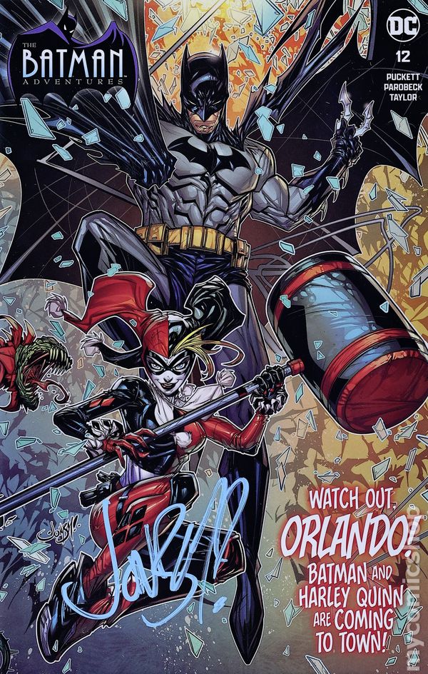 Fan Expo Exclusive "Orlando" Edition Wraparound Gatefold Variant Cover by Jonboy Meyers - limited to 1000 copies. 1st appearance of Harley Quinn in a comic book. "Batgirl: Day One." Barbara Gordon attends a costume party dressed as Batgirl. Unfortunately, Poison Ivy and Harley Quinn also decide to show up. Based on Batman The Animated Series. Script by Kelley Puckett, pencils by Mike Parobeck, inks by Rick Burchett. Cover by Parobeck. NOTE: Generic image is of a signed copy, this does not necessarily reflect all copies.
