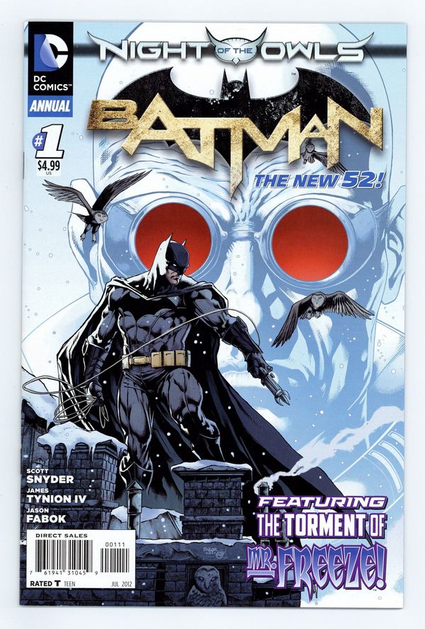 Night of the Owls Tie-in - (W) Scott Snyder, James Tynion IV. (A/CA) Jason Fabok. MR. FREEZE is introduced to The New 52! What is Mr. Freeze's relationship to the COURT OF OWLS? Is he an ally - or do they want him dead? 'NIGHT OF THE OWLS' continues here! Cover price $4.99.