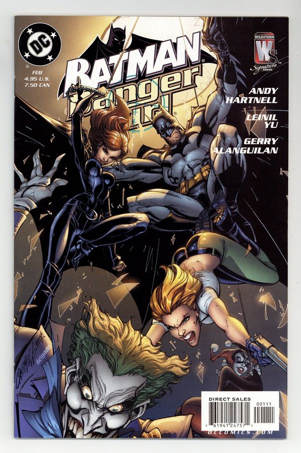 Tags: BatmanPublished Feb 2004 by DC/Wildstorm.$27.00Written by Andy Hartnell Art by Leinil Yu & Gerry Alanguilan Covers by Yu and J. Scott Campbell. Danger comes to Gotham City in this action-packed 48-page Special featuring art by Leinil Yu & Gerry Alanguilan (SUPERMAN: BIRTHRIGHT)! Danger Girl mentor Deuce dispatches Abbey Chase, Sydney Savage, Johnny Barracuda and Valerie on an assignment in Gotham City, home base of Batman! Meanwhile, Donavin Crane, arch-nemesis of the girls, is also in the big G, and forms an unlikely alliance with one of Batman's greatest foes! Adventure, mirth and mayhem ensue as the Dark Knight joins forces with the hottest spy chicks in comics! 48 pg, FC, $4.95 US Cover price $4.95.