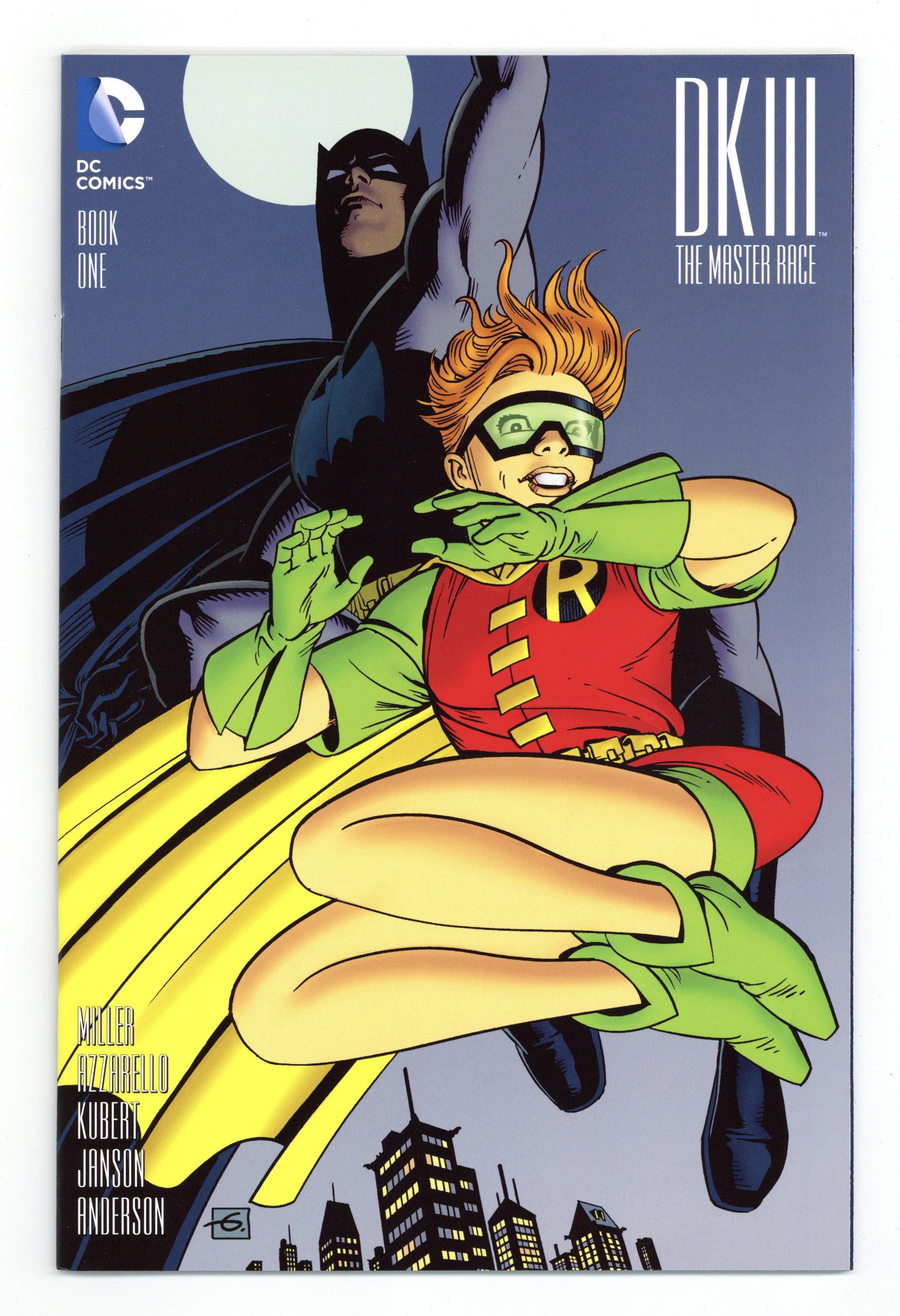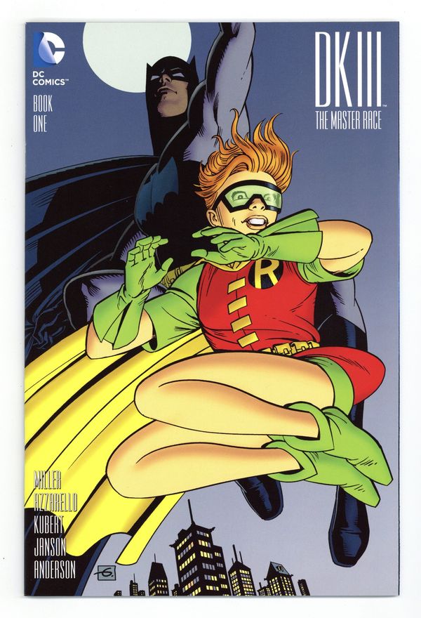 Limited 1 for 50 Retailer Incentive Variant Cover. Written by Frank Miller and Brian Azzarello. Art by Andy Kubert and Klaus Janson. Cover by Dave Gibbons. The epic ending you never saw coming is here because you demanded it! The Dark Knight rises again to face the dawn of the master race! 36 pages, full color. Includes a bound-in, 12 page mini-comic (5 1/2-in X 8 1/2-in): Dark Knight Universe Presents: Atom. #1