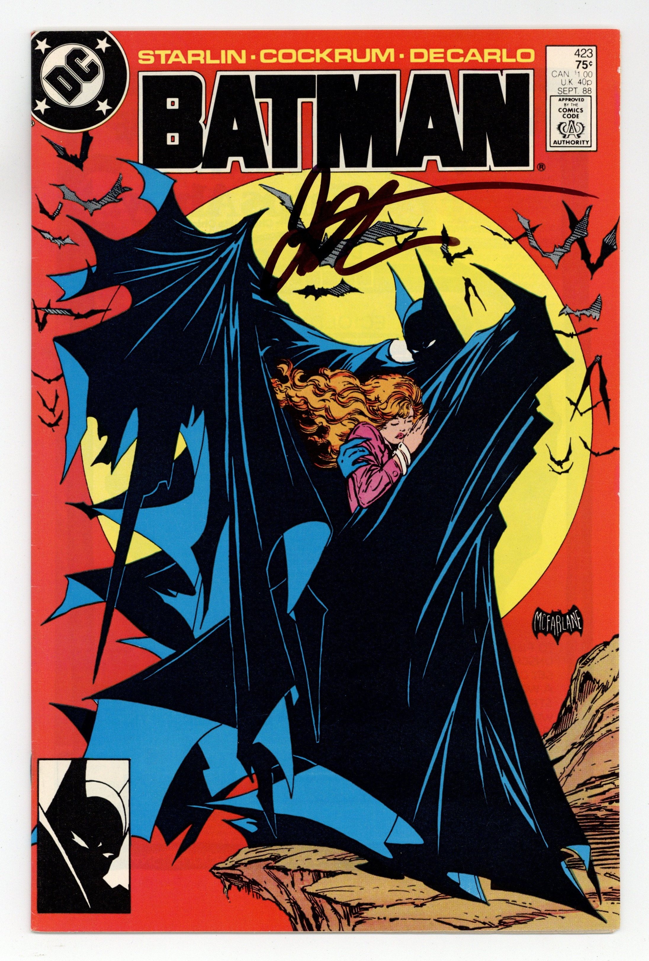 Ends Dec 22 7:40 PM CST Bid History 13 bids Current Bid $310 Your Secret Max Bid If you'd like to bid, please log in or register. 1st Printing. Direct Edition. Three cops relate three tales of the Dark Knight, revealing different facets of Batman's character, in "You Shoulda Seen Him..." Script by Jim Starlin, pencils by Dave Cockrum, inks by Mike DeCarlo. Todd McFarlane cover. 1st printing. NOTE: Most issues from 397-432 were reprinted in 1989 and sold in multipacks. These 2nd and 3rd prints have back cover ads dated 1989. 36 Pages, Full Color. Cover price $0.75.