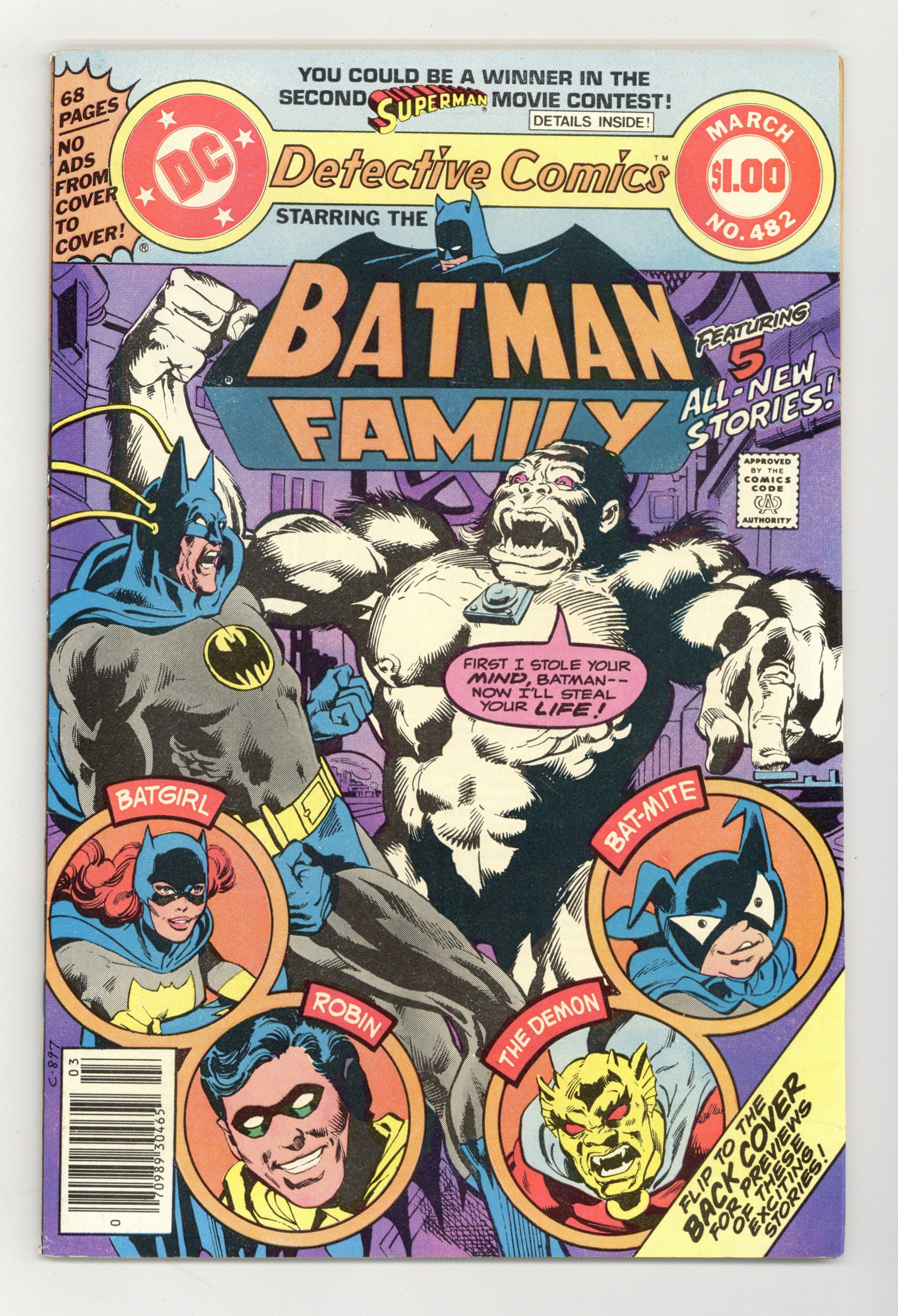68-page giant. Cover pencils by Rich Buckler, inks by Dick Giordano. "Night of the Body Snatcher!" script by Jim Starlin, pencils by Jim Starlin, inks by P. Craig Russell; Batman is overpowered by the white ape-body of Xavier Simon and must quickly find a way to prevent Simon from transferring his own mind into the Caped Crusaders body. "A Quick Death in China!" script by Bob Rozakis, pencils by Don Heck, inks by Frank Chiaramonte; Wo Fong mistakenly thinks Barbara Gordon's friend, Leslie, is really Batgirl and tries to make her reveal super-heroic secrets; Meanwhile, the real Batgirl and her brother Tony Gordon team together to combat Wo Fong and his Sino-Supermen. "The Eternity Book" starring The Demon, script by Len Wein, pencils by Mike Golden, inks by Dick Giordano. "Bat-Mite's New York Adventure!" script by Bob Rozakis, pencils by Michael Golden, inks by Bob Smith. "The League of Crime!" starring Robin, script by Bob Rozakis, pencils by Juan Ortiz, inks by Dave Hunt. 68 pgs., full color. $1.00. Cover price $1.00.