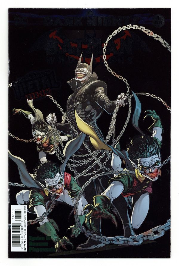 Tags: Dark Nights Metal (DC) (part 21), Batman$18.00Written by James Tynion IV. Art by Riley Rossmo. Cover by Jason Fabok. As the events of DARK NIGHTS: METAL rock the DC Universe, the creatures of the Dark Multiverse stand ready to invade our world! How can the World's Greatest Heroes stop a horde of deadly beings that appear to be powerful nightmare versions of familiar figures? Find out in these special tie-in issues! 32 pages, full color, Rated T+ Cover price $3.99.