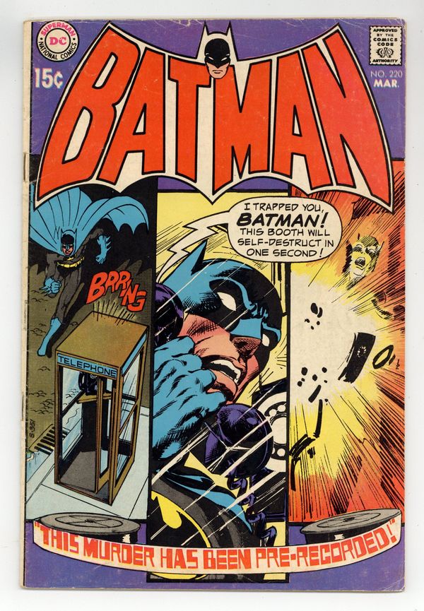 Cover pencils by Neal Adams and Carmine Infantino (layout), inks by Neal Adams. "This Murder Has Been ... Pre-Recorded!", script by Frank Robbins, pencils by Irv Novick, inks by Dick Giordano; The murder of a construction company owner leads Batman to a plot by the killer to murder Marla Manning, a lady journalist investigating the crime; Manning first contacts Bruce Wayne, as she was the writer responsible for informing the people about the Wayne Foundation's Victims Program, and she had learned about the murder; Bruce promises her to contact Batman and later that night, he visits her and together they start investigating the case more closely; Batman contacts Commissioner Gordon about the case of Marla Manning's death threat; Batman follows the clues to a man called Nova, who was the main suspect of the crime; However, Batman couldn't find any proof of his guilt and is forced to return to Marla empty handed; Then, they come up with the idea of posting a note in Marla's newspaper story about how she would reveal the identity of the killer in the next issue. Letter to the editor from comic writer Martin Pasko. Statement of ownership: The average number of copies sold per issue during the previous year was 355,782. 36 Pages, Full Color. Cover price $0.15.