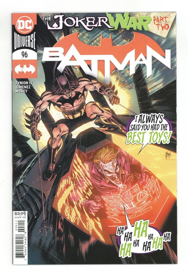 $4.00Joker War: Part 2 of 6 - Written by James Tynion IV. Art by Jorge Jimenez. Cover by Guillem March. Reeling from the effects of the worst Joker toxin attack ever, Batman is on the run through Gotham City, pursued by the dark shadows and voices that haunt his past and present! As The Joker's plan materializes, the only person who can save Batman from the brink of true madness...is Harley Quinn?! Plus, who is the mysterious new figure known as Clownhunter? 32 pages, full color. Rated T+ Cover price $3.99.