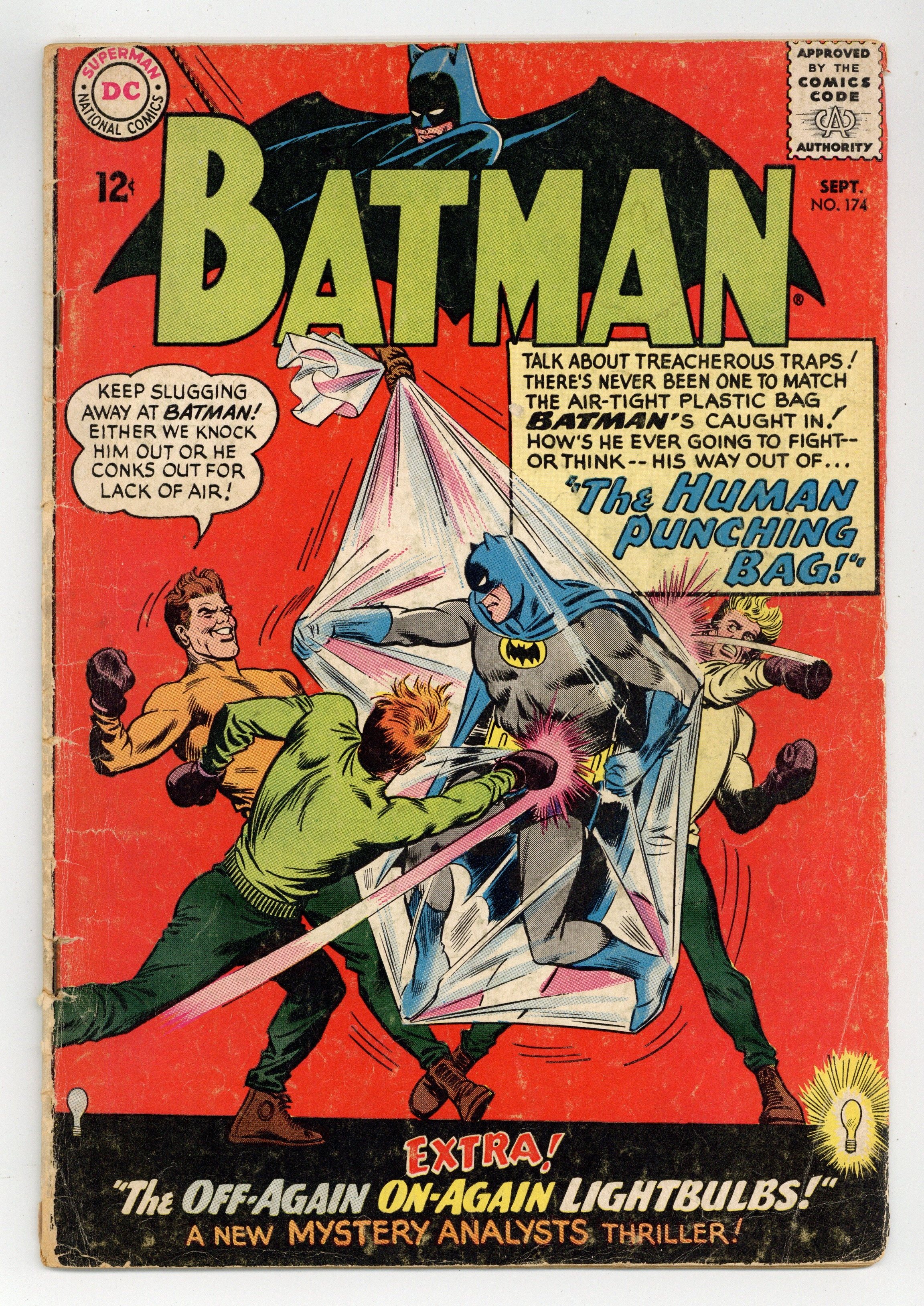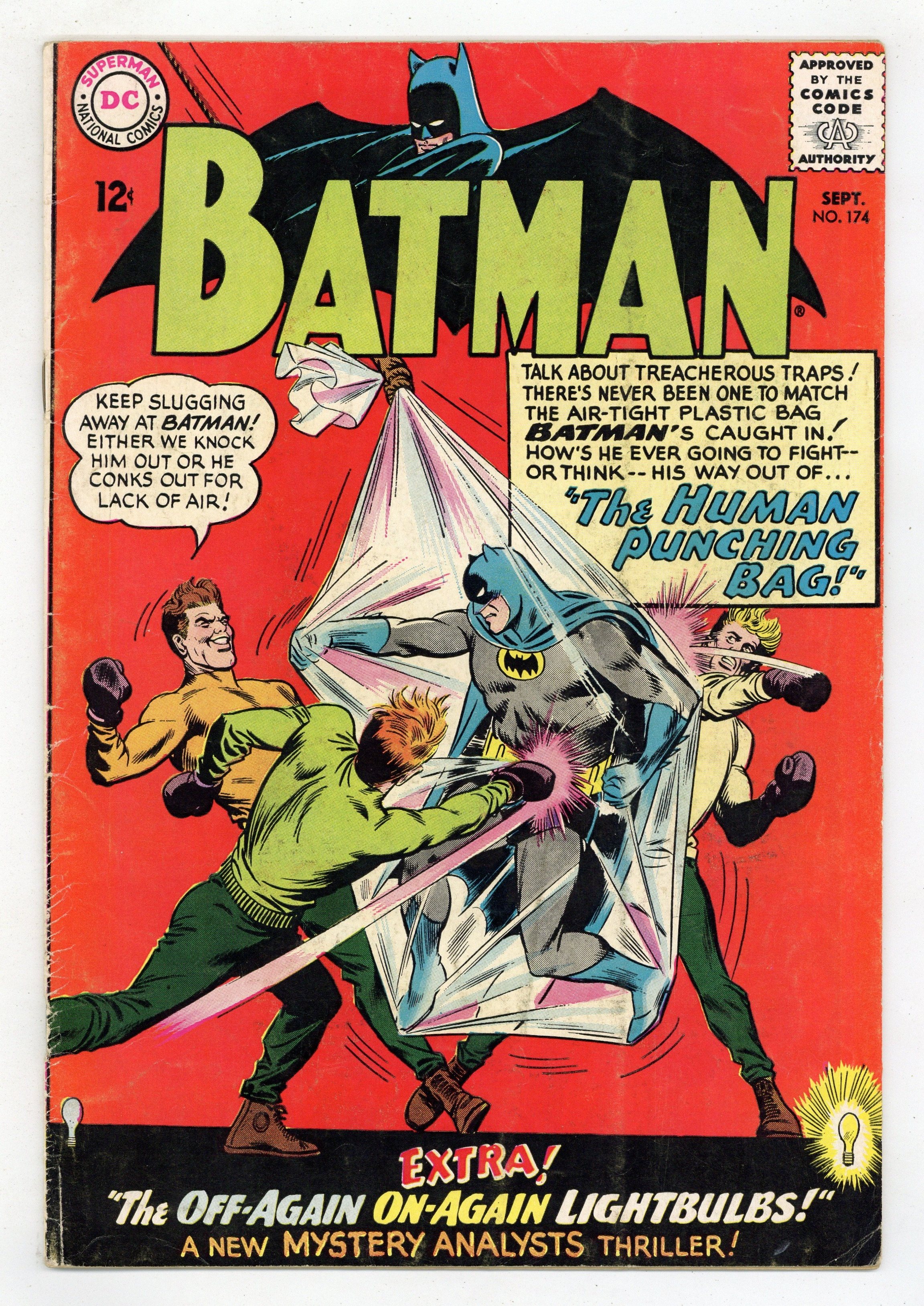 Cover pencils by Carmine Infantino, inks by Joe Giella. "The Human Punching Bag!", script by Gardner Fox, pencils by Sheldon Moldoff (as Bob Kane), inks by Joe Giella; Hunter breaks the Getaway Genius out of jail in order to provide a getaway gimmick, all the while planning a trap for the Batman. The Time of Death article. "Nature's Bill of Rights," script by Jack Schiff, art by Sheldon Moldoff; Two boys who are polluting a stream are given an anti-pollution lesson by a fisherman. "The Off-Again On-Again Lightbulbs!", script by Gardner Fox, pencils by Sheldon Moldoff (as Bob Kane), inks by Sid Greene; When Batman arrives at the Wednesday meeting of the Mystery Analysts, a cleaning man enters and announces that it is actually Friday, and he can prove it with a copy of that day's paper; Before anyone can question why, the cleaning man hypnotizes the group, not realizing the Batman is unaffected. Half-page Little Pete story by Henry Boltinoff. Rocky and Bullwinkle star in a one-page Cheerios ad. 36 Pages, Full Color. Cover price $0.12.