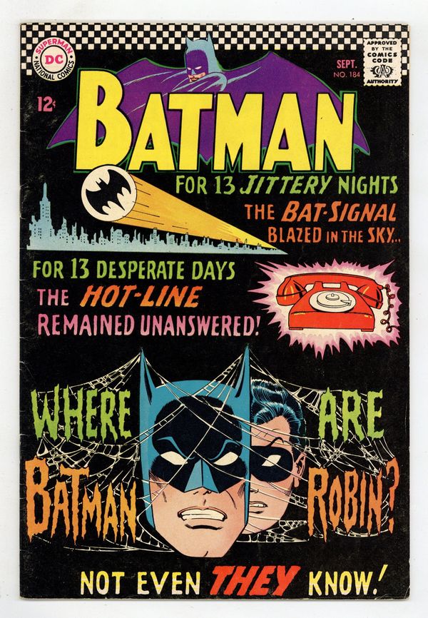 Starts Jan 3 Cover pencils by Carmine Infantino, inks by Murphy Anderson. "Mystery of the Missing Manhunters!", script by Gardner Fox, pencils by Sheldon Moldoff (as Bob Kane), inks by Joe Giella; The Caped Crusaders mysteriously disappear for two weeks, and when they return, they have no memory of where they have been. Letter from Marvel colorist and editorial assistant Irene Vartanoff. Cap's Hobby Hints activity half-page by Henry Boltinoff. "The Boy Wonder's Boo-Boo Patrol!", script by Gardner Fox, pencils by Sheldon Moldoff (as Bob Kane), inks by Sid Greene; Robin, who is on patrol alone, thinks that someone is trying to kill Viola Lance, a stunt girl, when she experiences several motorcycle accidents. 36 Pages, Full Color. Cover price $0.12.