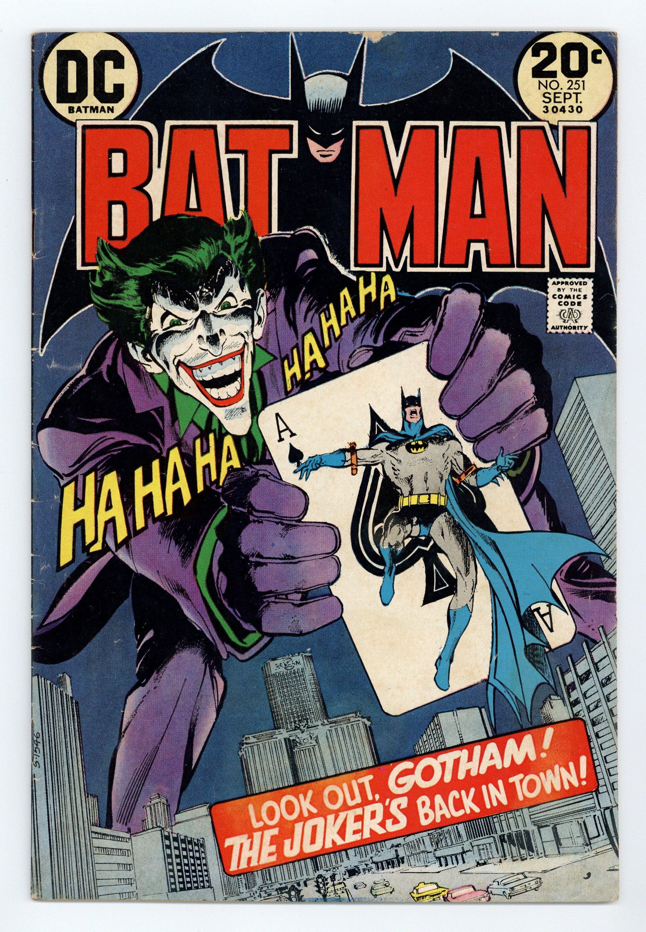Cover art by Neal Adams. "The Joker's Five-Way Revenge!", script by Denny O'Neil, art by Neal Adams; The Joker has set himself free from the Mental Hospital for the Criminally Insane Batman had him incarcerated in, and he is out for blood; Before he was sent away, knowing that one member of his previous gang had ratted him out to the police, he had vowed to murder all five of them; And only the Batman is capable of stopping him; Despite Batman's best efforts, the Joker is able to finish off nearly all of his hit list; Batman is only alerted after the first murder, when a grinning corpse is found in the mud just outside of Gotham City, and he goes to each of the former members of the Joker's gang individually to try to protect them. Plop! comic book ad. Champion Sports comic book ad. 36 Pages, Full Color. Cover price $0.20.