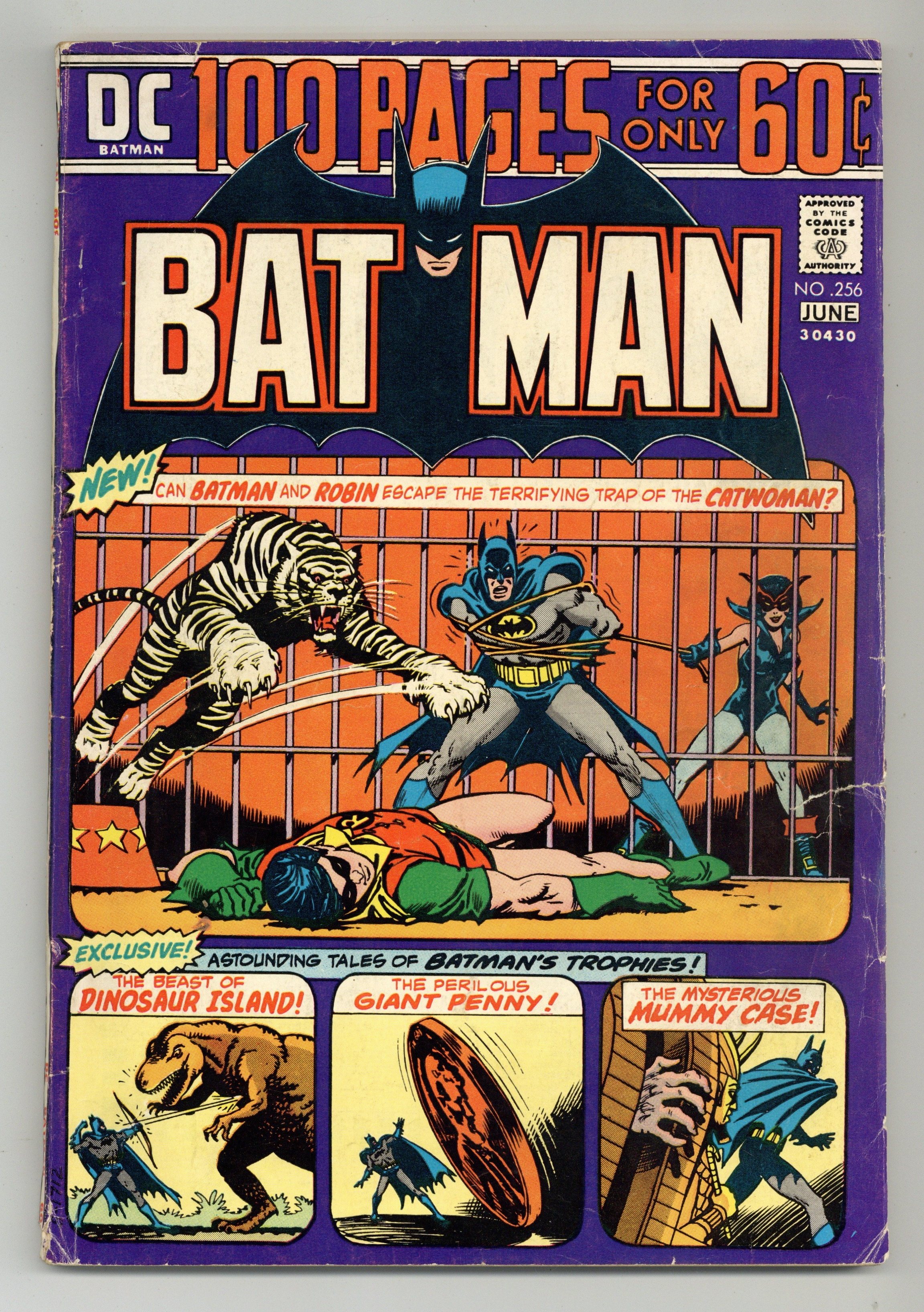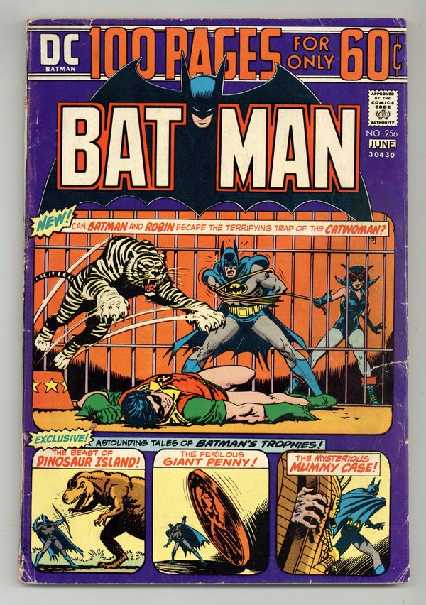100-page giant. Cover by Nick Cardy. Ever wonder where Batman got those wonderful trophies for the Bat-Cave from? Well, this exciting issue answers that questions and tells the tales of Batman's trophies. "Catwoman's Circus Caper!", script by Denny O'Neil, pencils by Irv Novick, inks by Dick Giordano; When Bruce discovers that Dick has left Hudson University to investigate some mystery at the Tip-Top Circus, Batman decides to join the Teen Wonder to investigate a murder at the circus. "Dinosaur Island!", script by Bill Finger, pencils by Paul Cooper (as Bob Kane), inks by Ray Burnley; Batman and Robin are challenged to a game of "Touch Hunt" on famed Dinosaur Island in return for a gift to charity in the amount of $5000...if they win the game. "The Penny Plunderers!", script by Bill Finger, pencils by Bob Kane, inks by Ray Burnley; Throughout his life, Joe Coyne felt threatened, done in by pennies and coppers, so he decides to use the "copper penny" as a trademark of his crimes. "Brothers in Crime!", script by Don Cameron, pencils by Jerry Robinson, inks by Jerry Robinson and George Roussos (backgrounds); While visiting their trophy room, the Caped Crusaders come across a bullet-proof vest, a keepsake from a case involving the Rafferty Brothers, who unwittingly implicated their brother Peter in a murder. "The Thousand and One Trophies of Batman!", script by Edmond Hamilton, pencils by Bob Kane, inks by Charles Paris; As they add trophy 1000 to the Bat-Cave's collection, the Caped Crusaders decide to check over the other trophies to make sure they are in good shape; The evil Dr. Doom is hiding inside and plans to rig some of the trophies in the Bat-Cave to kill the Dynamic Duo. "The Secret of Batman Island!" script by Bill Finger, pencils by Sheldon Moldoff (as Bob Kane), inks by Charles Paris; The founder/owner of Batman Island is followed home by criminals seeking films the man has been shooting that could finger them for a crime they committed. The Catwoman! character profile. 100 Pages, Full Color. Cover price $0.60.