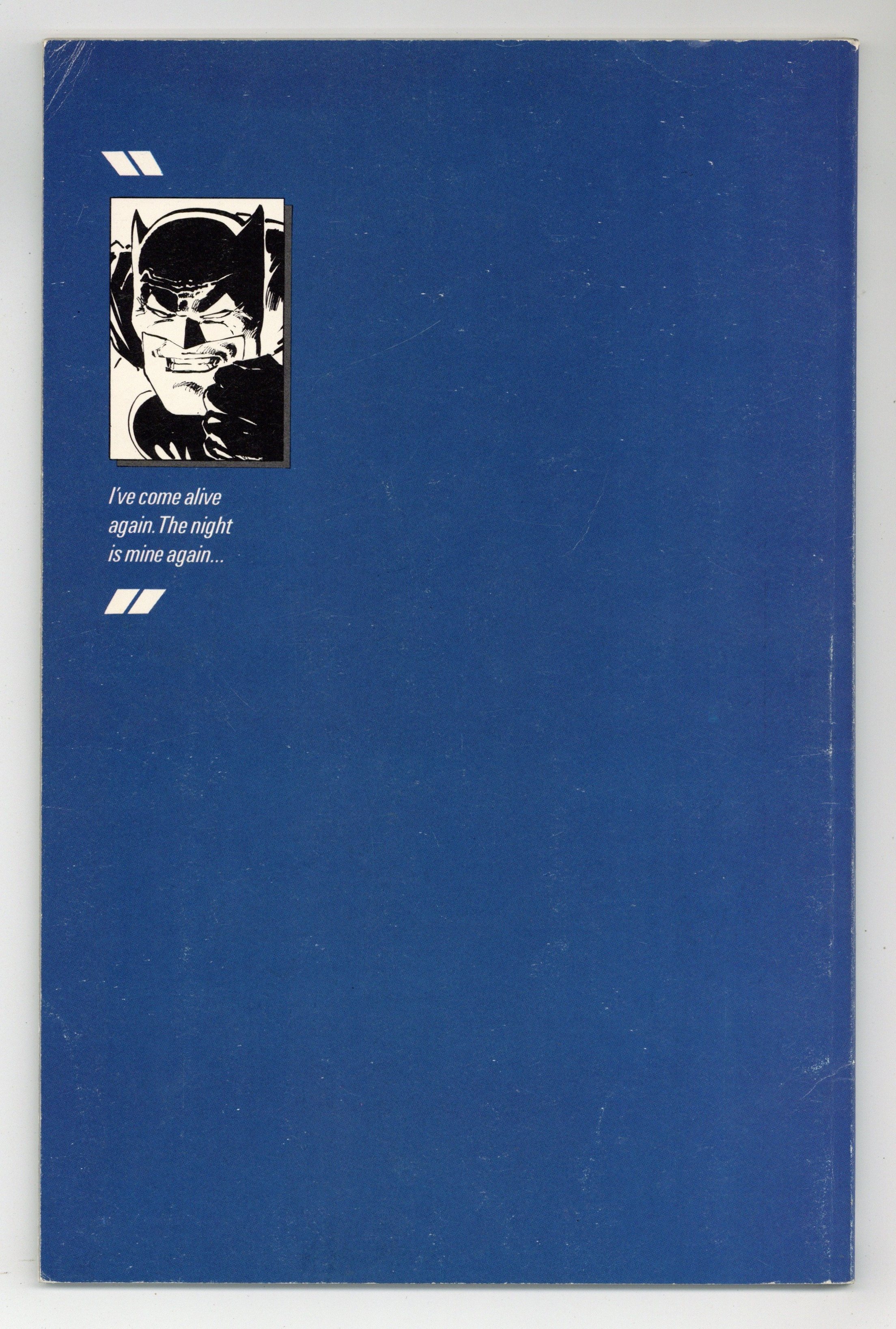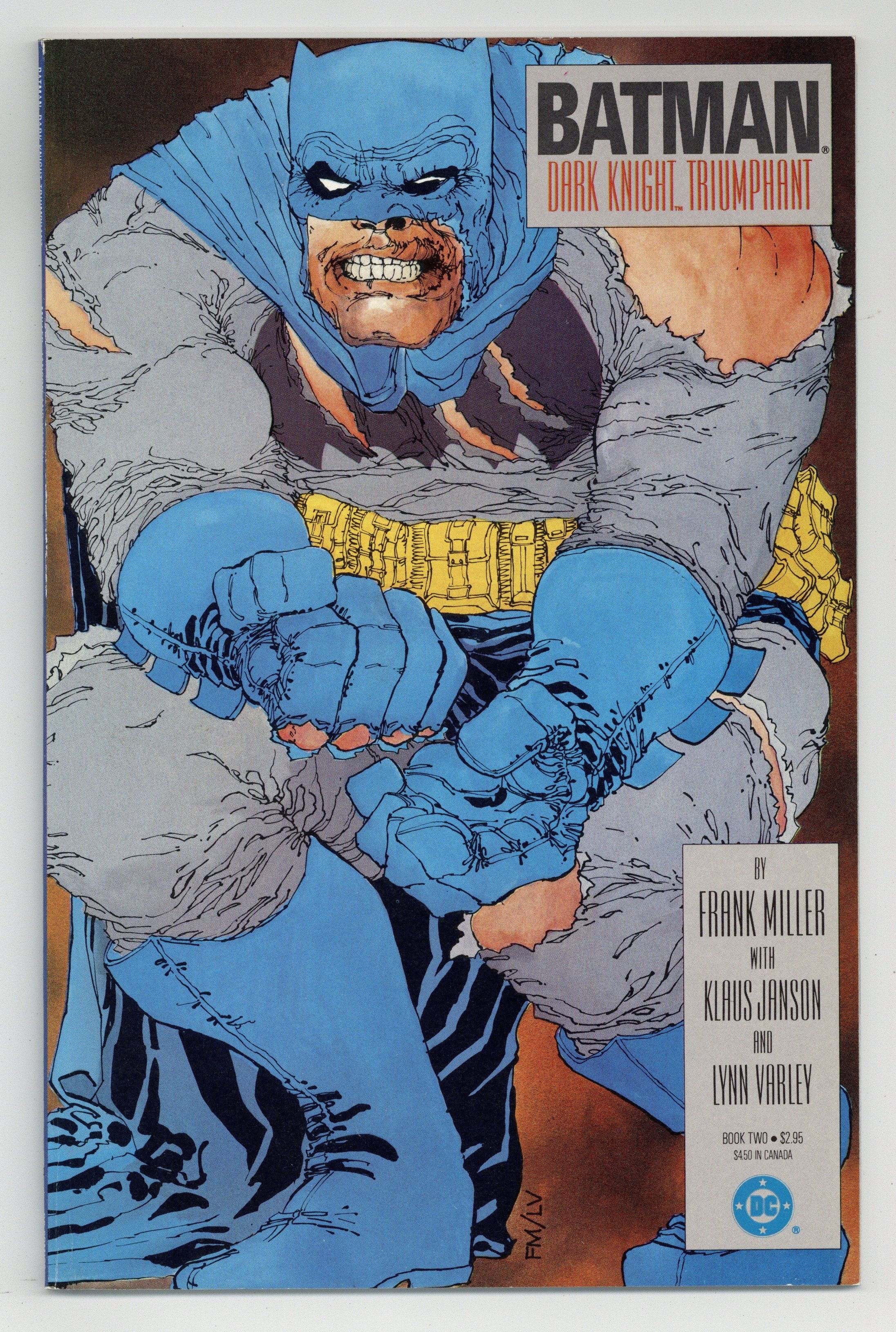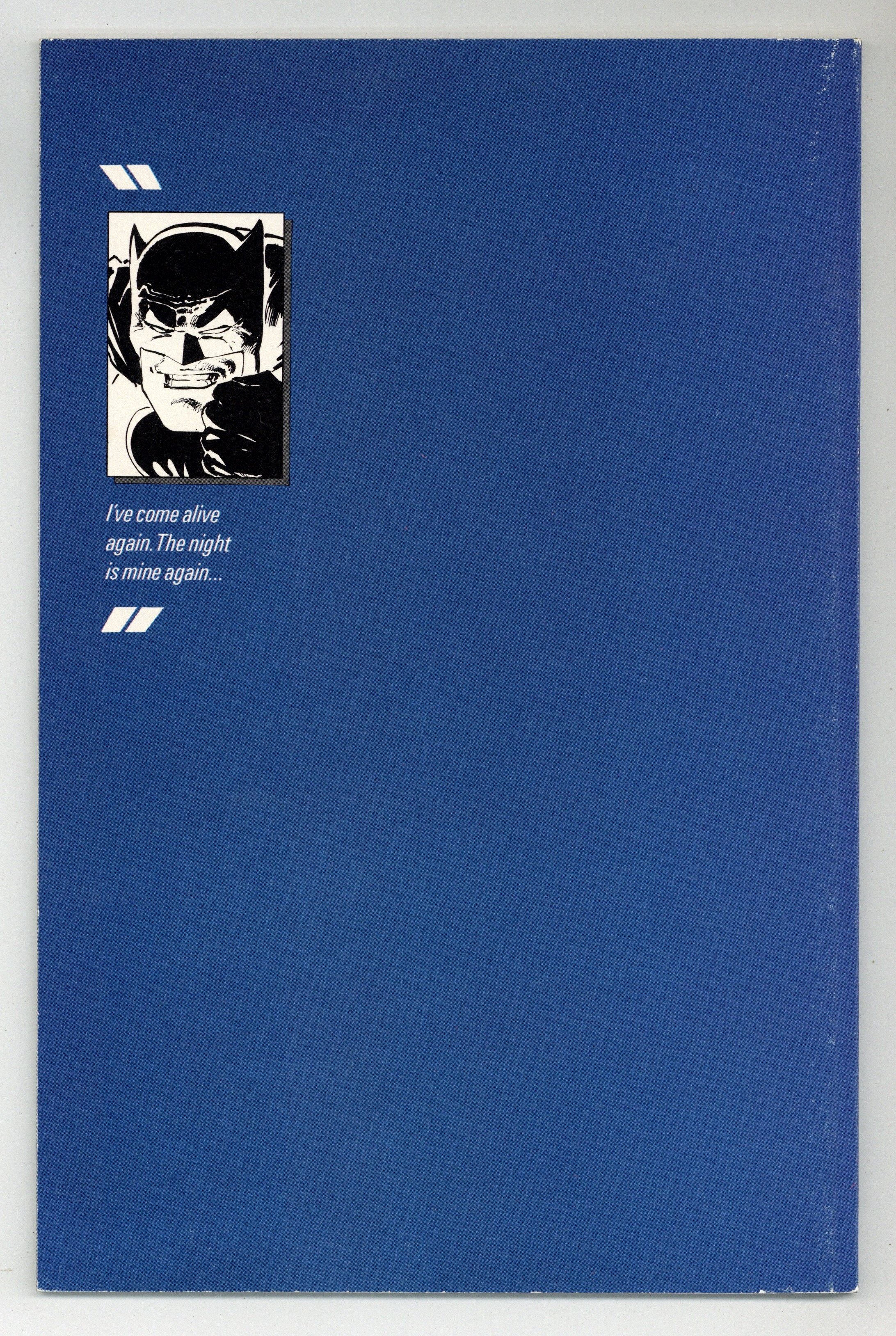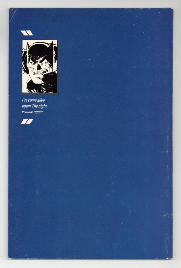 First printing. Direct Edition. NOTE: 1st printing has almost matching grey background on inside front cover and facing page. 2nd printing doesn't have matching gray background--grays are very different. 3rd printings are labeled as such. Cover by Frank Miller. "Dark Knight Triumphant," script by Frank Miller, pencils by Frank Miller, inks by Klaus Janson; an aging Batman battles the Mutant gang and their anonymous leader; While walking to work, considering retirement, Jim Gordon is almost killed by a 17-year old boy with an M60; Carrie Kelly, a young girl who owes her life to Batman, seeks out her hero and becomes Robin. 52 pgs., full color. Cover price $2.95.