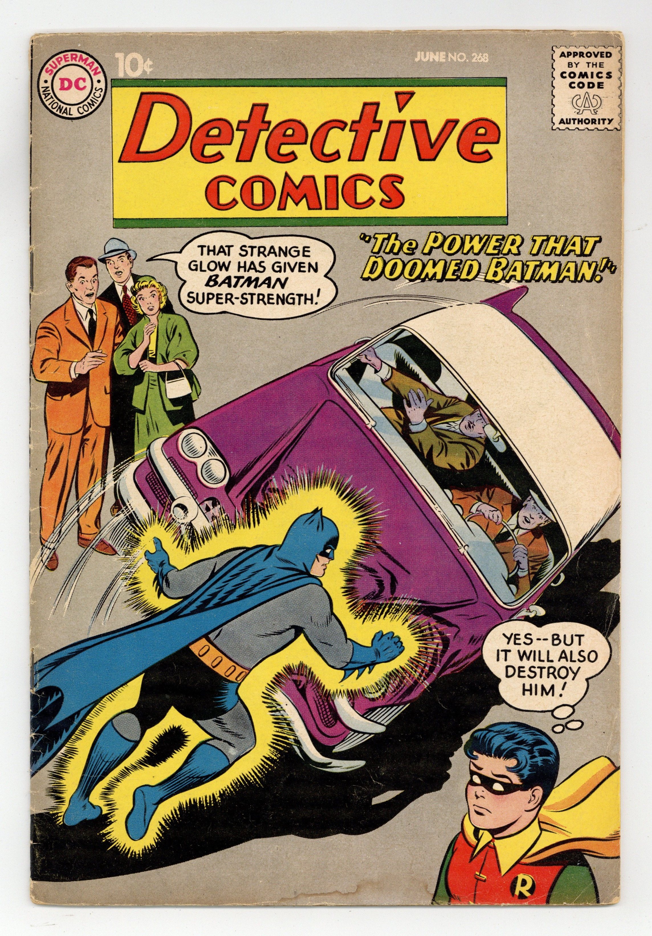 Cover pencils by Curt Swan, inks by Stan Kaye. "The Power That Doomed Batman" starring Batman and Robin, script by Bill Finger, pencils by Sheldon Moldoff, inks by Charles Paris; Batman takes up a plane on an experimental flight, and, after crossing the path of a strange comet, lands, revealing Batman with a strange glow...and super powers to boot. Warden Willis humor page by Henry Boltinoff. "Mystery of the Mercurian Masquerader" starring Roy Raymond TV Detective, art by Ruben Moreira; Roy vs. the Mercurian D'Lor. "The Mixed-Up Martian Powers" starring John Jones Manhunter from Mars, art by Joe Certa; A strange meteor switches all of the Manhunter's powers around. 36 pgs., full color. Cover price $0.10.